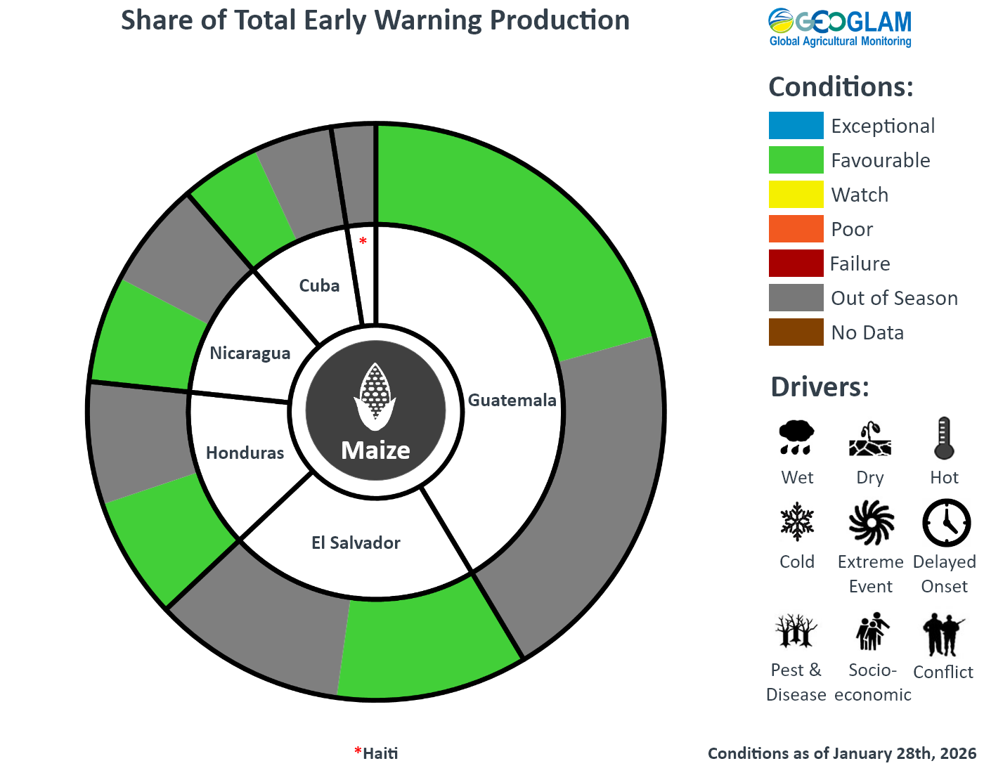 Crop condition map synthesizing maize conditions as of January 28th. Crop conditions over the main growing areas are based on a combination of inputs including remotely sensed data, ground observations, field reports, national, and regional experts. Conditions that are other than favourable are labeled on the map with their driver.