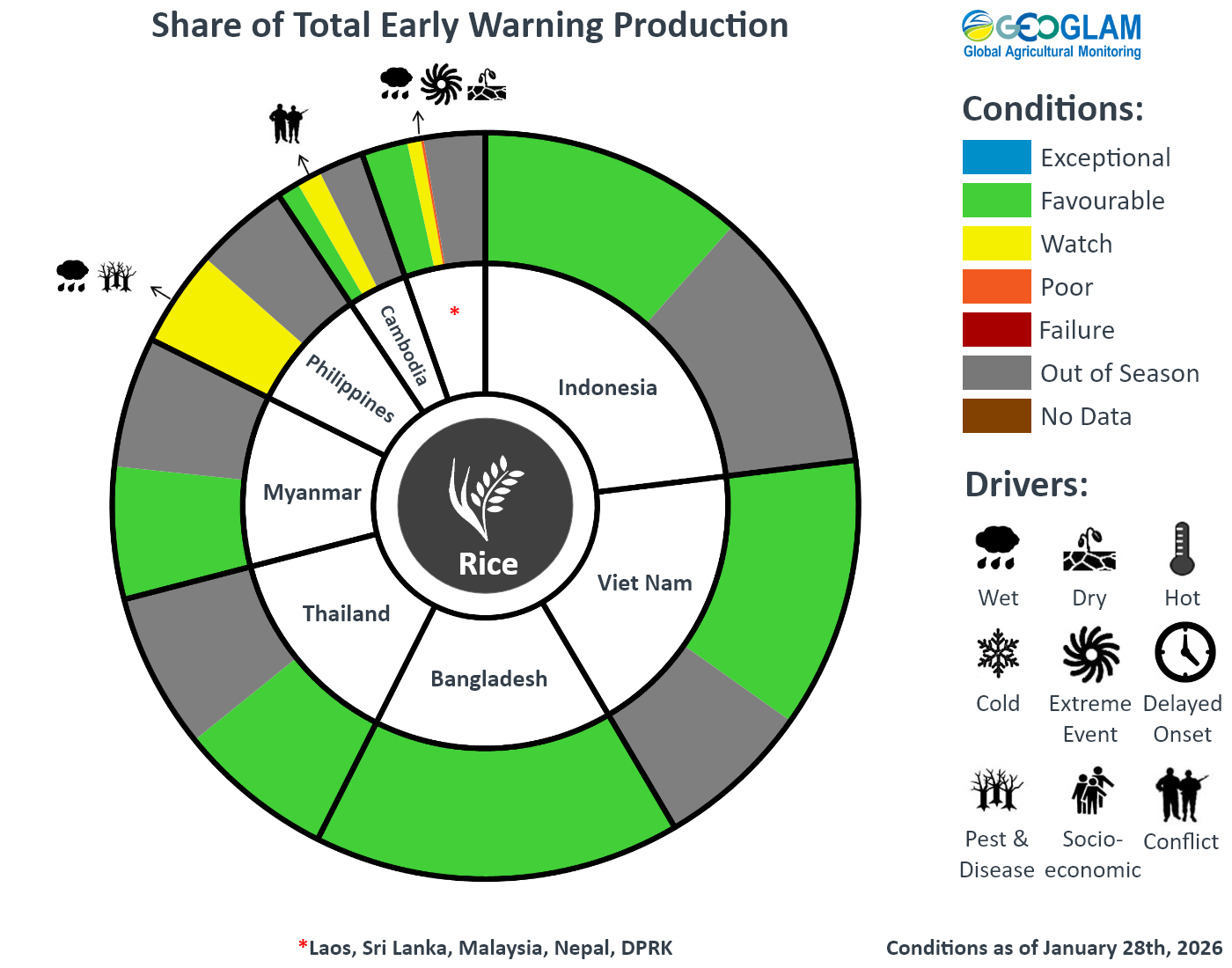 Pie Chart Description: Each slice represents a country’s share of total regional production. The proportion within each national slice is colored according to the crop conditions within a specific growing area; grey indicates that the respective area is out of season. Sections within each slide are weighted by the sub-national production statistics (5-year average) of the respective country. The section within each national slice also accounts for multiple cropping seasons (i.e. spring and winter wheat) and are a result of combining totals from multiple seasons to represent the total yearly national production. When conditions are other than favourable icons are added that provide information on the key climatic drivers affecting conditions.