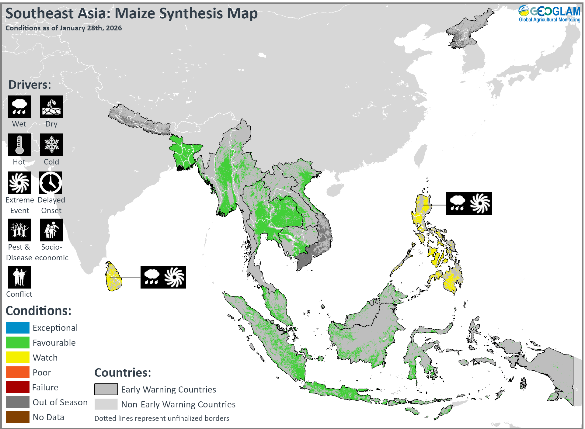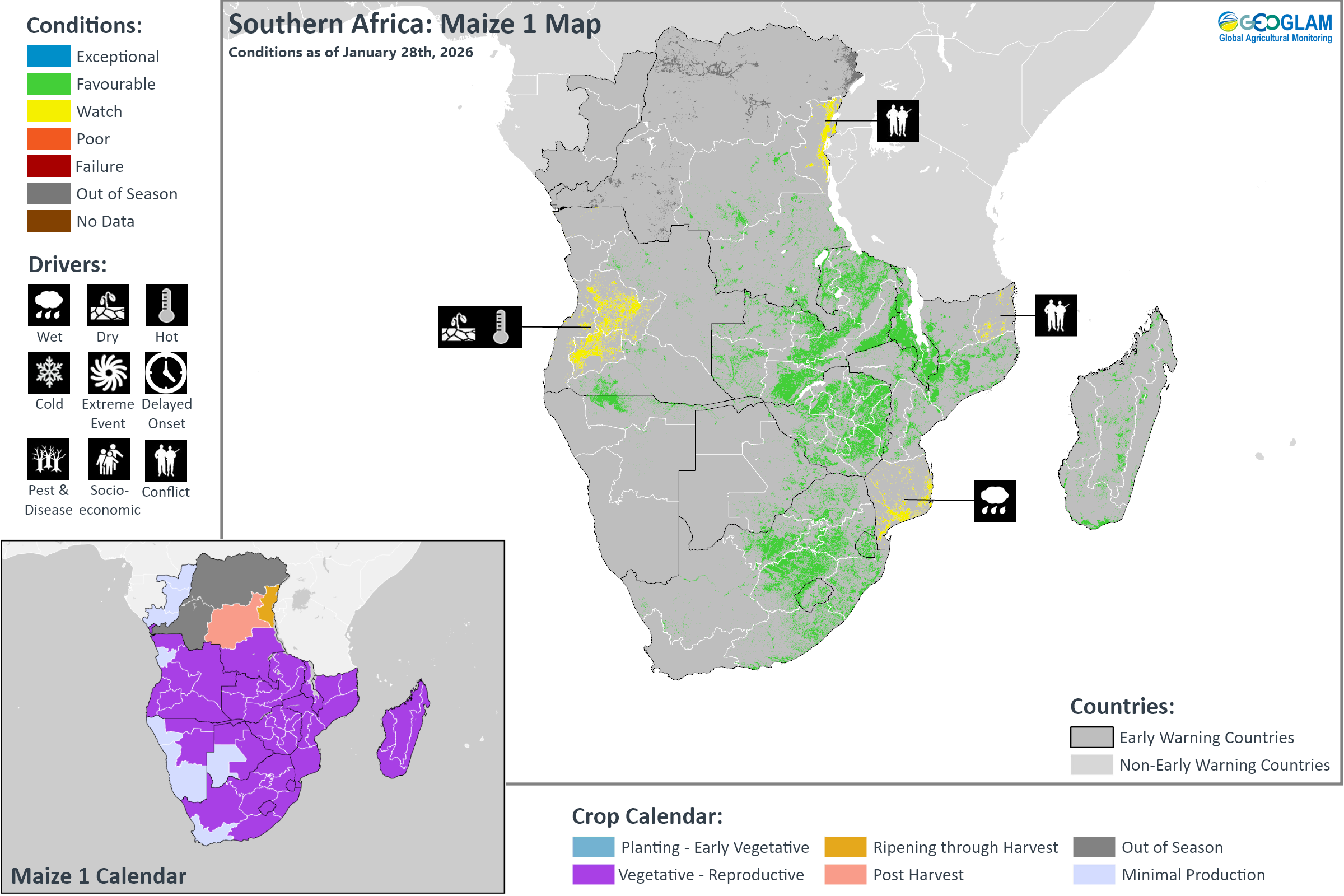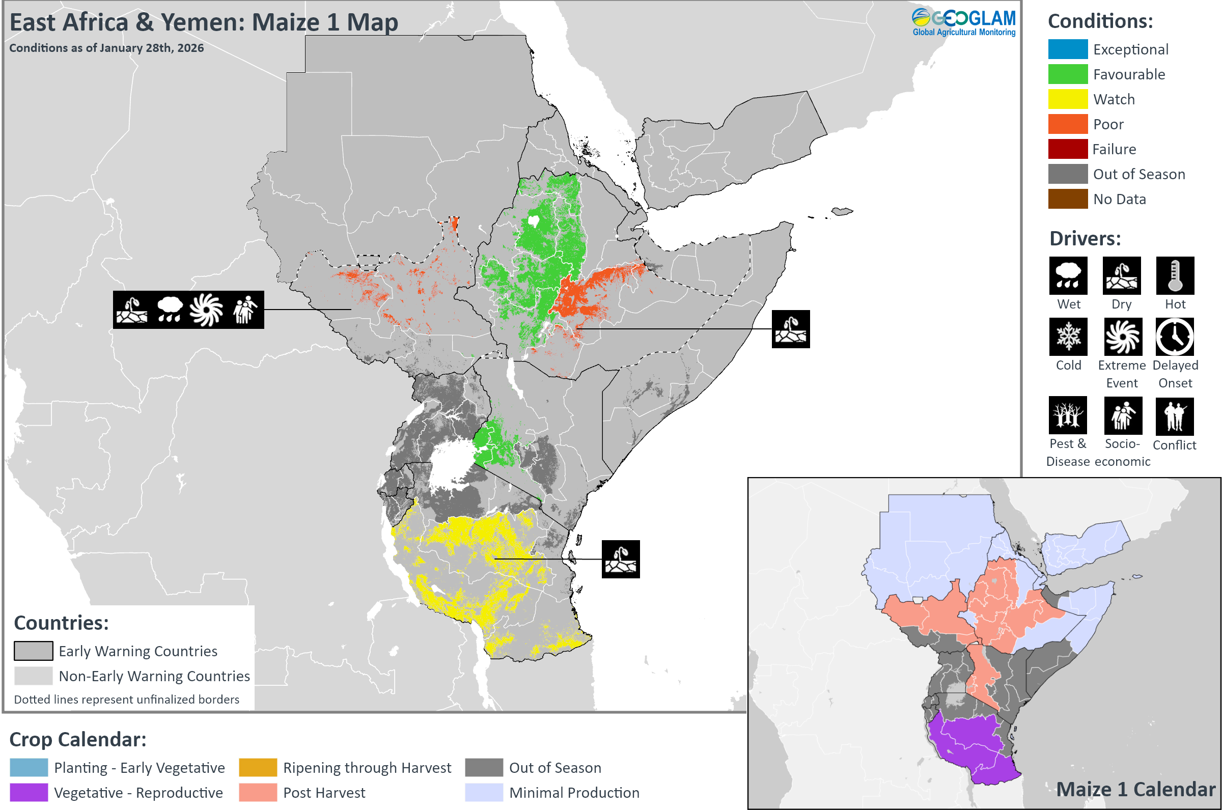 Crop condition map synthesizing Maize 1 conditions as of January 28th. Crop conditions over the main growing areas are based on a combination of inputs including remotely sensed data, ground observations, field reports, national, and regional experts. Crops that are in other than favourable conditions are labeled on the map with their driver.