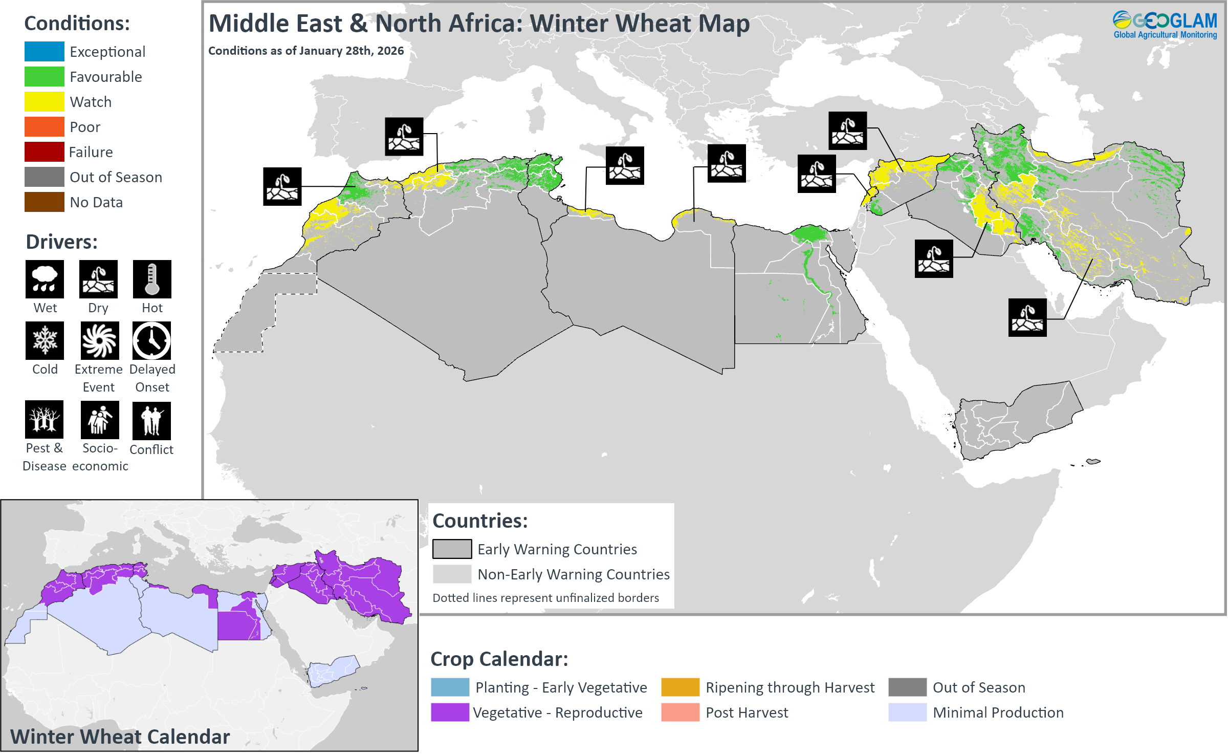 Crop condition map synthesizing Winter Wheat conditions as of January 28th. Crop conditions over the main growing areas are based on a combination of inputs including remotely sensed data, ground observations, field reports, national, and regional experts. Crops that are in other than favourable conditions are labeled on the map with their driver.