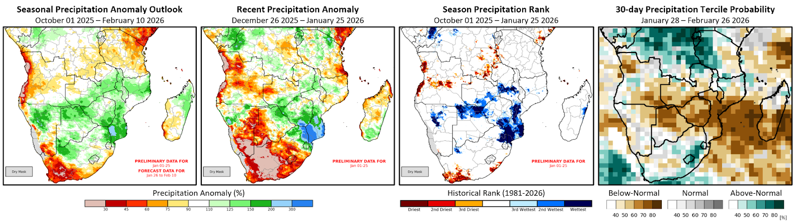 Figure 1. Seasonal rainfall anomaly, recent rainfall anomaly, season rainfall rank, and 30-day rainfall probability forecast. Left, middle-left, and middle-right panels are CHC Early Estimates, which compare recent precipitation totals to the 1981–2025 CHIRPS average for the respective accumulation period. All three panels use CHIRPS3 Preliminary for January 1-25, 2026. Left and middle-left: Percent of average precipitation for October 1st, 2025, to February 10th, 2026, and for December 26th, 2025, to January 25th, 2026, respectively. The seasonal anomaly outlook (Left) includes a 16-day CHIRPS3-GEFS forecast for January 26th to February 10th. Middle-right: Historical rainfall rank for October 1st, 2025, to January 25th, 2026. This shows how the total for this period compares to the historical record (1981-2024) for the same time period. Red and blue hues indicate the current season total is in the top 3 driest or wettest events of the CHIRPS record. Right: SubC multi-model rainfall tercile probability forecast for January 28th to February 26th, 2026. From UCSB CHC SubC.