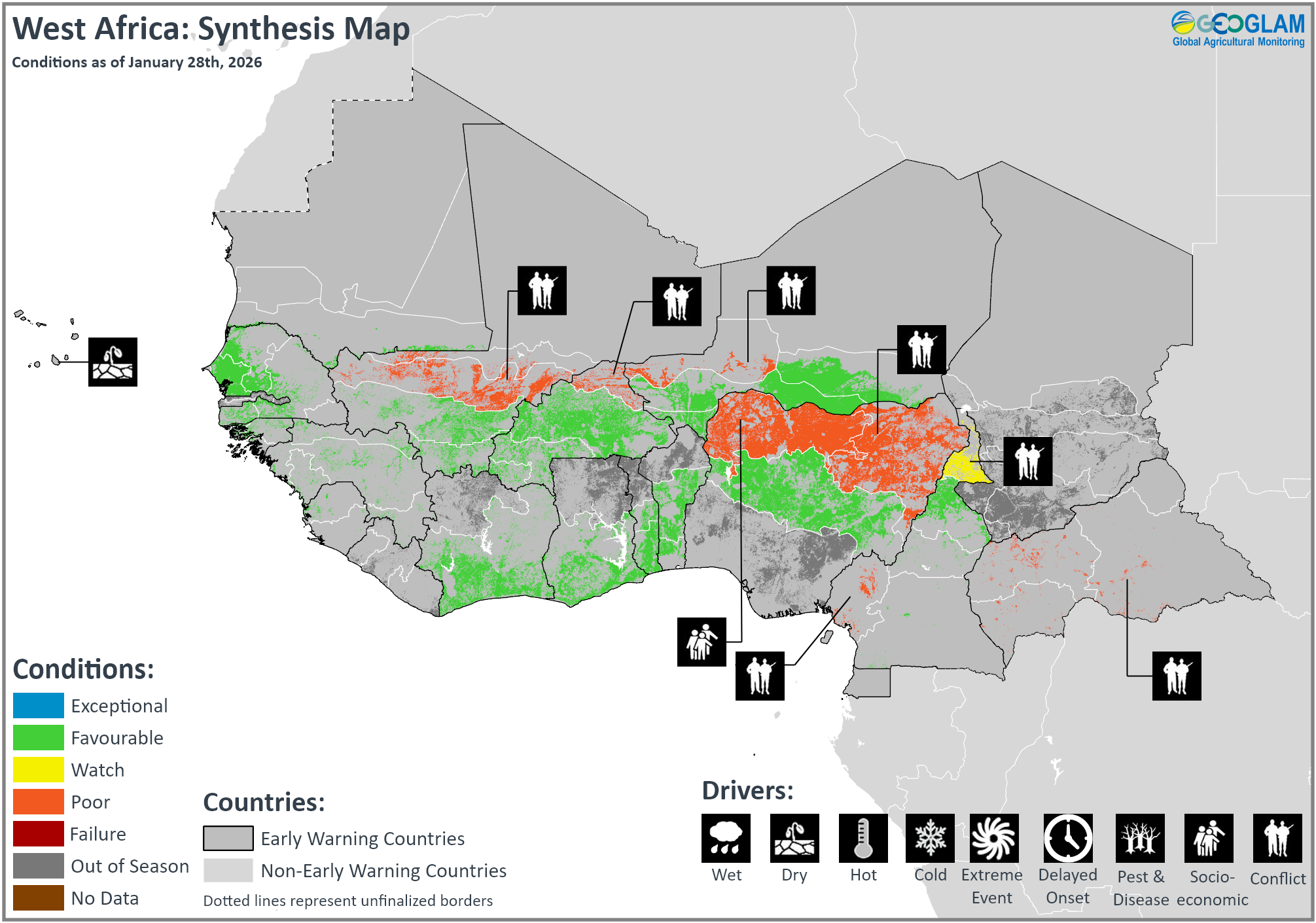 Crop condition map synthesizing information for all Crop Monitor for Early Warning crops as of January 28th. Crop conditions over the main growing areas are based on a combination of inputs including remotely sensed data, ground observations, field reports, national, and regional experts. Regions that are in other than favourable conditions are labeled on the map with a symbol representing the crop(s) affected.
