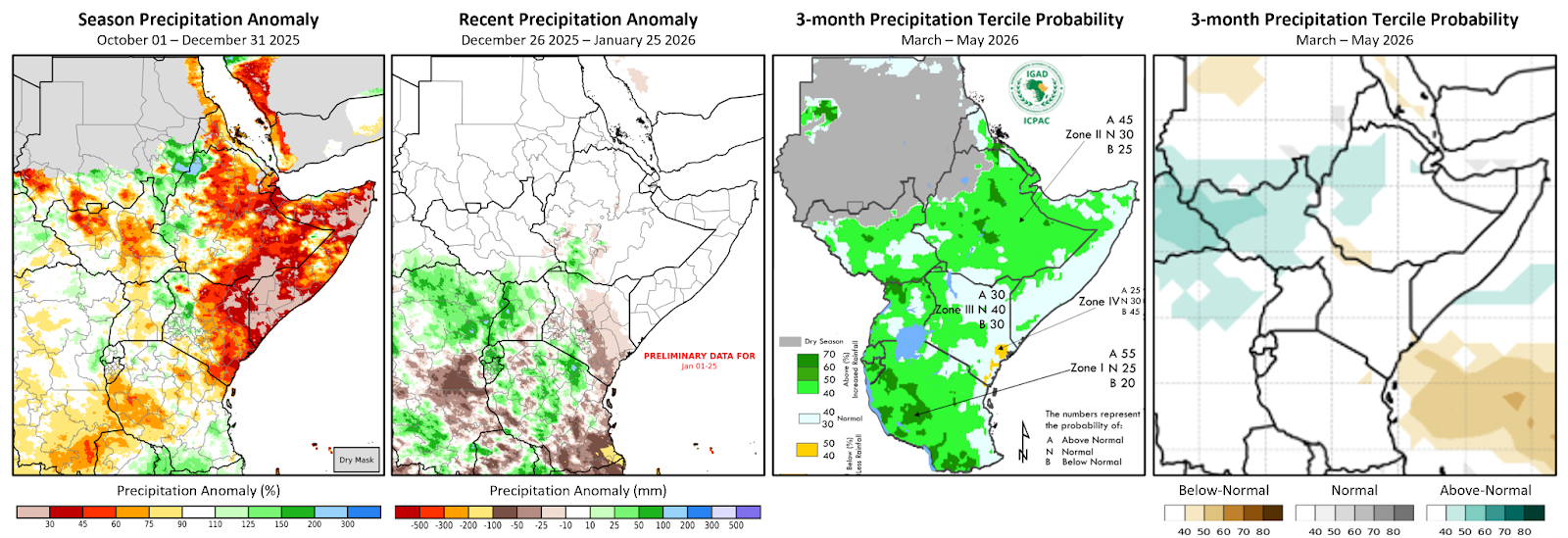 Figure 1. A seasonal rainfall anomaly, recent rainfall anomaly, and 3-month rainfall forecast. Left and middle-left panels are CHC Early Estimates, which compare recent precipitation totals to the 1981–2024 CHIRPS average for the respective accumulation period. Left: The percent of average precipitation for October 1st to December 31st, 2025, using CHIRPS data for October 1st to December 31st. Middle-left: This panel shows precipitation anomaly for December 26th, 2025 to January 25th, 2026, using CHIRPS Preliminary data for January 01-25. Middle-right: Seasonal forecast for March to May (MAM) 2026 rainfall, from the 72nd Greater Horn of Africa Climate Outlook Forum (GHACOF 72). GHACOF 72 was held on January 26th to 27th, 2026, by IGAD Climate Prediction and Applications Centre (ICPAC), in collaboration with National Meteorological and Hydrological Services across the region, the World Meteorological Organization (WMO), and other international partners. Seasonal forecasts from 9 global producing centers were used to develop the outlook. Source: ICPAC. Right: SubC multi-model rainfall tercile probability forecast for March to May (MAM) 2026 rainfall. From UCSB CHC SubC.