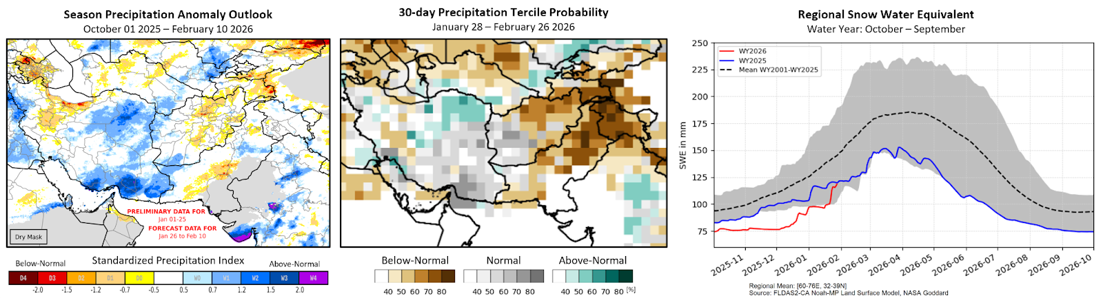 Figure 1. Season precipitation outlook, 30-day precipitation forecast, and the Afghanistan regional snow water equivalent. Left: Seasonal Standardized Precipitation Index (SPI) for October 1st, 2025, to February 10th, 2026, using CHIRPS3 preliminary data for January and a 16-day CHIRPS3-GEFS forecast for January 26th to February 10th. From the CHC Early Estimates. Middle: SubC multi-model rainfall tercile probability forecast for January 28th to February 26th, 2026. From UCSB CHC SubC. Right: Variations in regional Snow Water Equivalent (SWE) (mm) for a domain that encompasses most of Afghanistan and parts of southern Tajikistan and northern Pakistan, in Hindu Kush and Pamir mountain range areas. The dotted line indicates average SWE (2001-2025 period), the blue line shows SWE for Oct. 2024 - Sep. 2025, and the red line shows SWE for Oct. 1st, 2025, to January 27th, 2026. From NASA, using SWE estimates from the FLDAS Central Asia model.