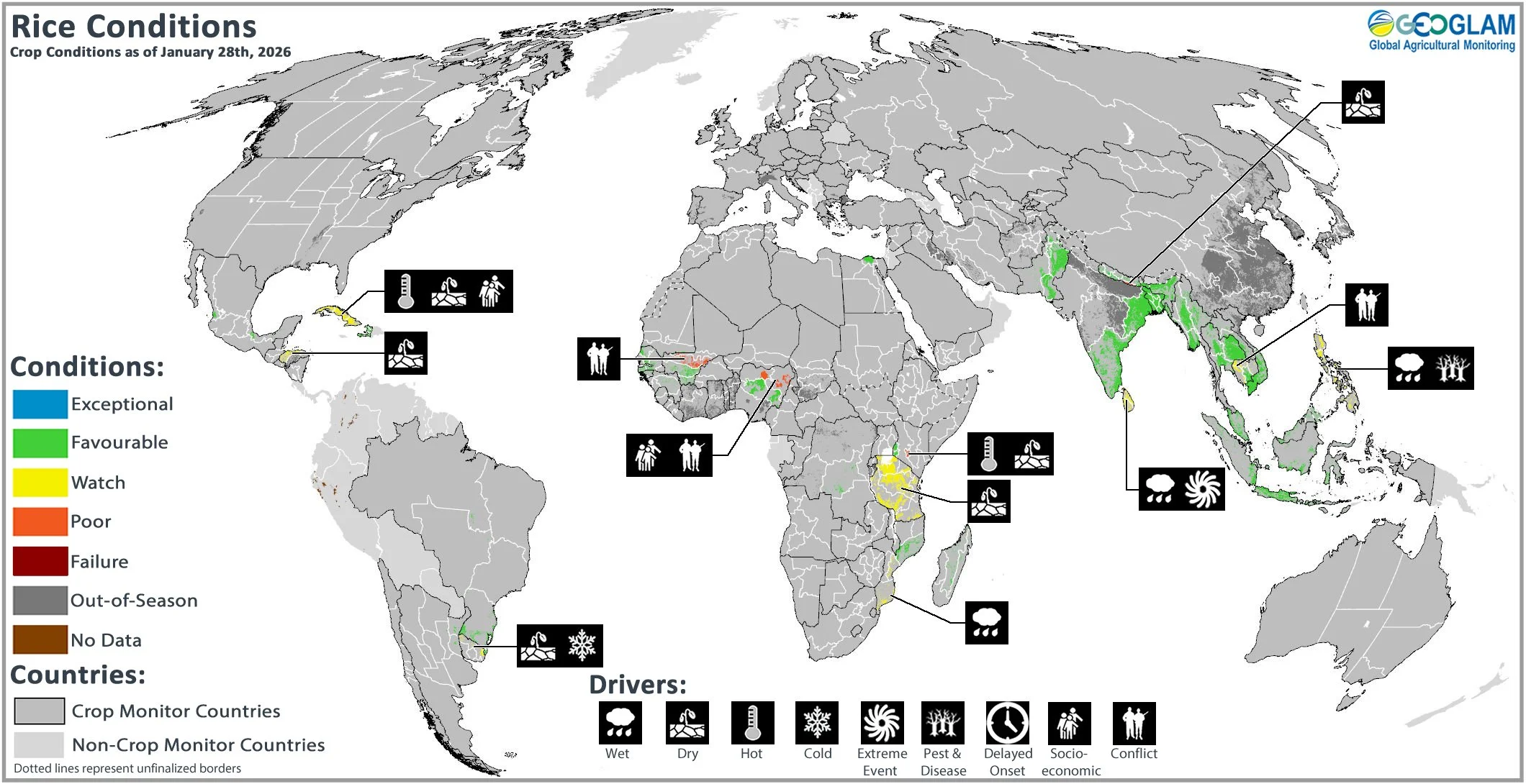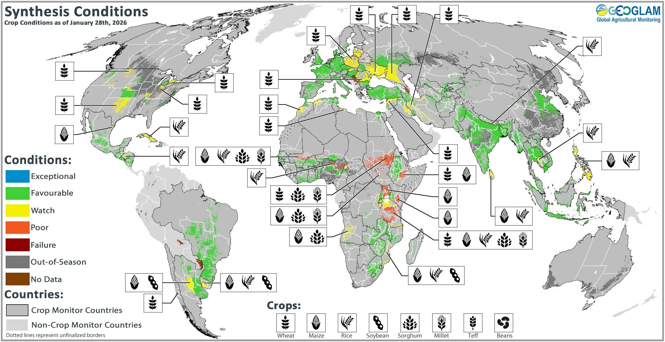 Crop conditions over the main growing areas are based on inputs, including remotely sensed data, ground observations, field reports, and national and regional experts. Regions in conditions other than favourable are labelled on the map with a symbol representing the crop(s) affected.