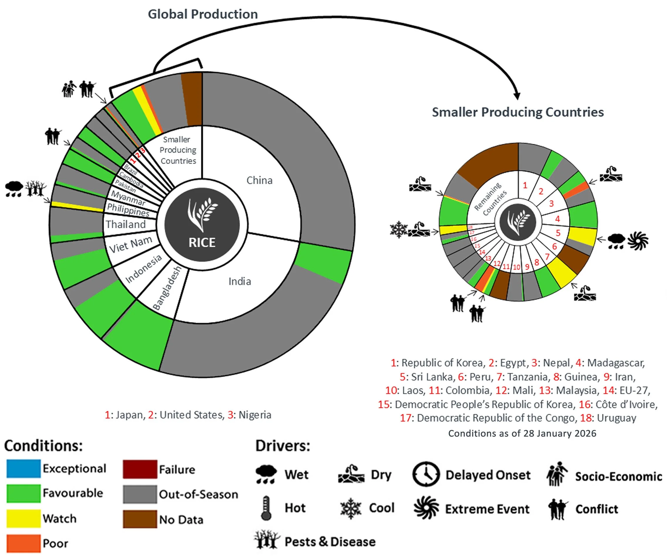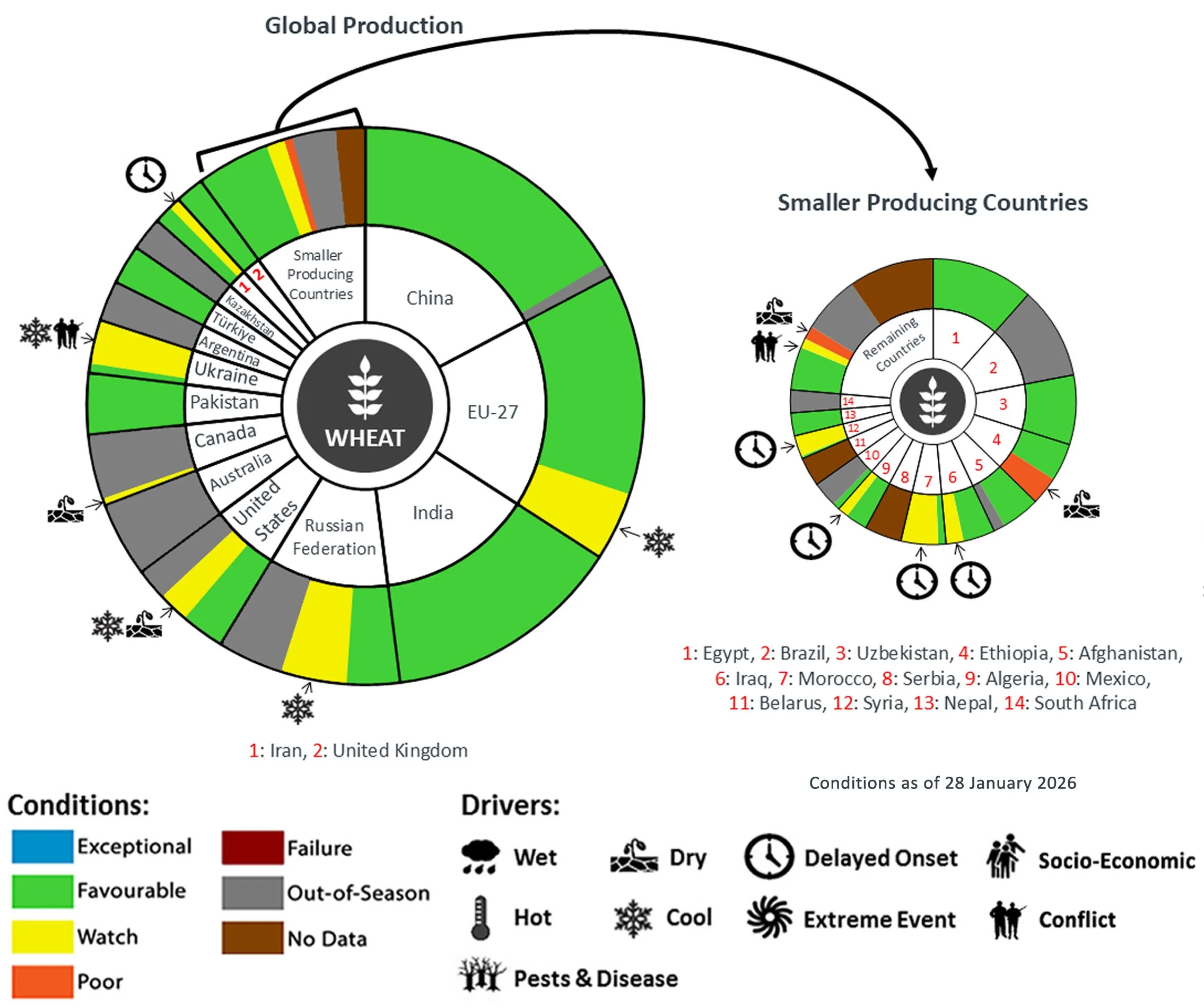 Pie Chart Description: Each slice represents a country's share of total Global production (5-year average). Main producing countries (representing 90-95 percent of production) are shown individually, with the remaining 5-10 percent grouped into the “Smaller Producing Countries” category. The proportion within each national slice is coloured according to the crop conditions within a specific growing area; grey indicates that the respective area is out of season. Sections within each slide are weighted by the sub-national production statistics (5-year average) of the respective country. The section within each national slice also accounts for multiple cropping seasons (e.g., spring and winter wheat). When conditions are other than ‘favourable’, icons are added that provide information on the key climatic drivers affecting conditions.