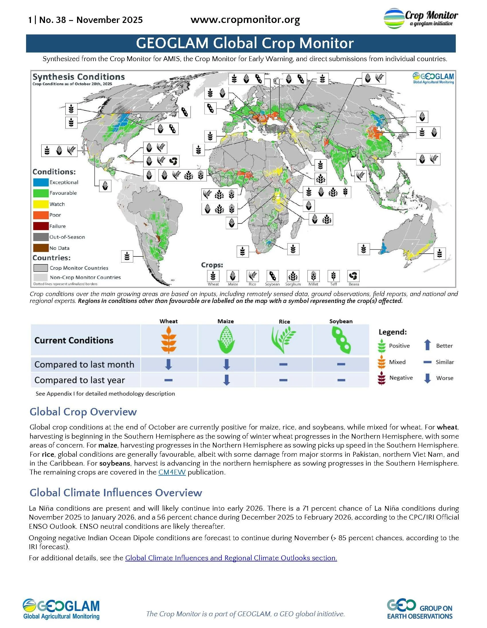 Global crop conditions at the end of October are currently positive for maize, rice, and soybeans, while mixed for wheat. For wheat, harvesting is beginning in the Southern Hemisphere as the sowing of winter wheat progresses in the Northern Hemisphere, with some areas of concern. For maize, harvesting progresses in the Northern Hemisphere as sowing picks up speed in the Southern Hemisphere. For rice, global conditions are generally favourable, albeit with some damage from major storms in Pakistan, northern Viet Nam, and in the Caribbean. For soybeans, harvest is advancing in the northern hemisphere as sowing progresses in the Southern Hemisphere. The remaining crops are covered in the CM4EW publication.