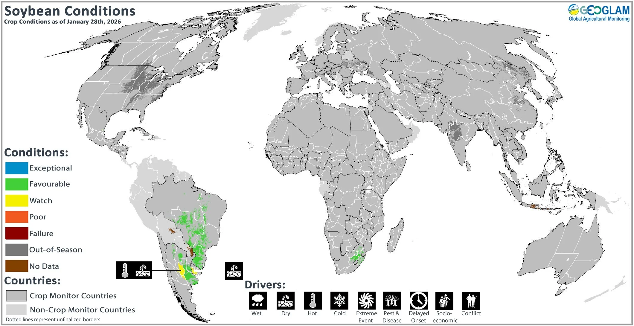 Soybean crop conditions over the main growing areas are based upon a combination of national and regional crop analyst inputs, along with earth observation data. Conditions are based upon information as of January 28th.