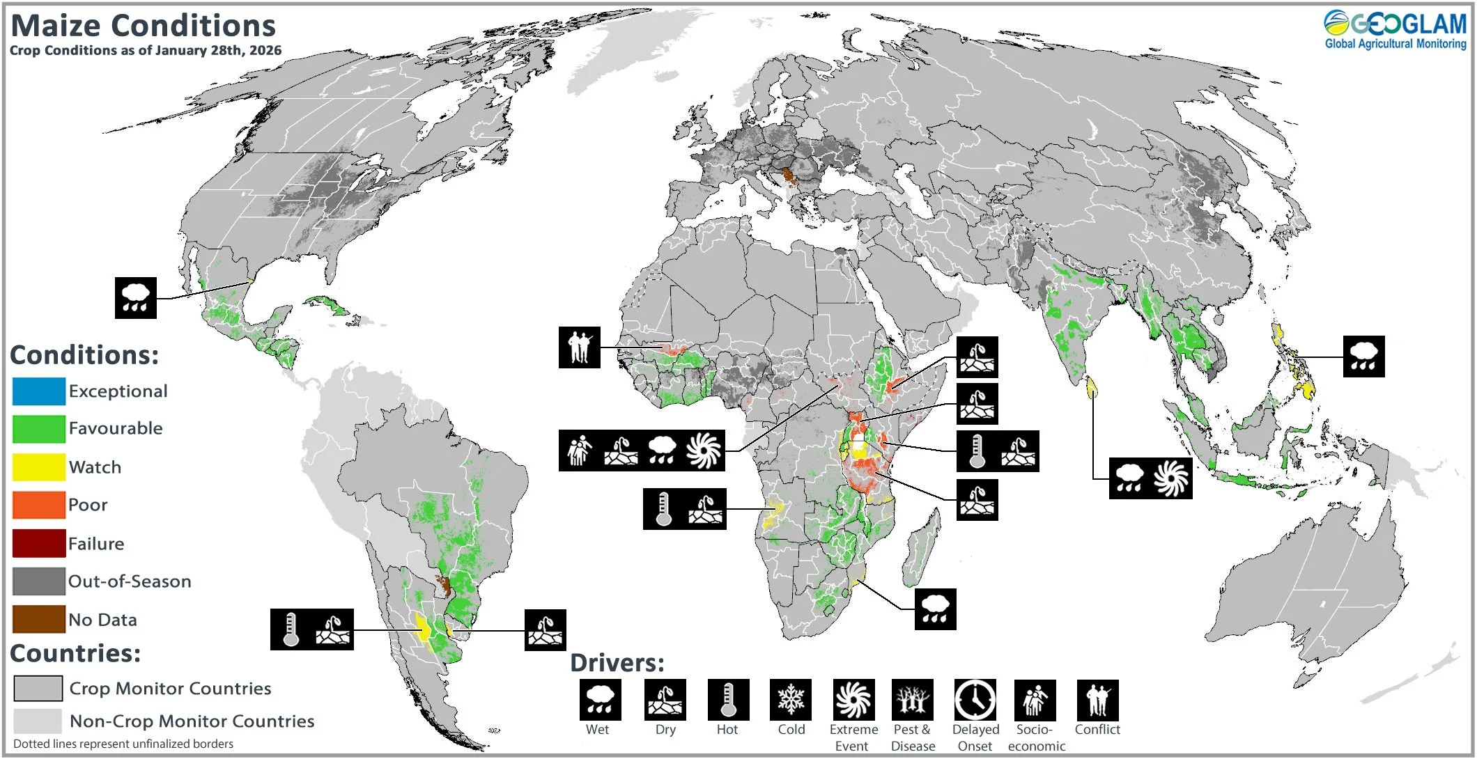 Maize crop conditions over the main growing areas are based upon a combination of national and regional crop analyst inputs, along with earth observation data. Conditions are based upon information as of January 28th.