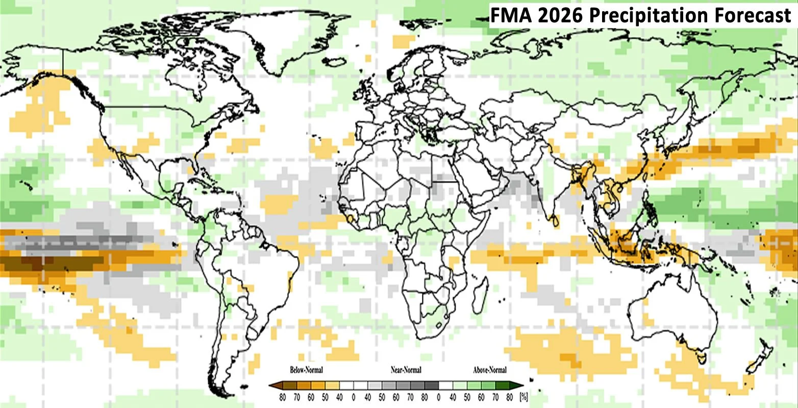 Figure 3: : Based on September conditions, a probability forecast for the most likely February-March-April (FMA) 2026 rainfall tercile. The white colour indicates that there is no dominant category across the model forecasts. Source: WMO Lead Centre for Long-Range Forecast Multi-Model Ensemble