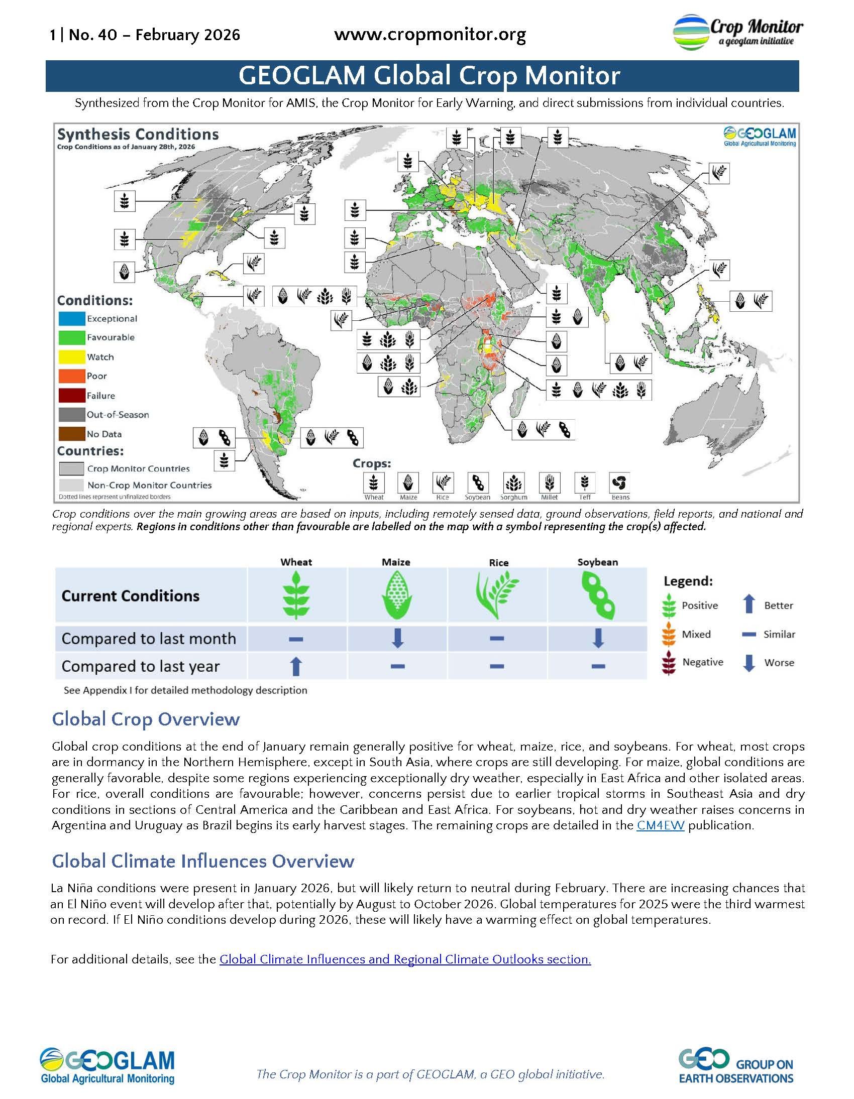 Synthesized from the Crop Monitor for AMIS, the Crop Monitor for Early Warning, and direct submissions from individual countries.
