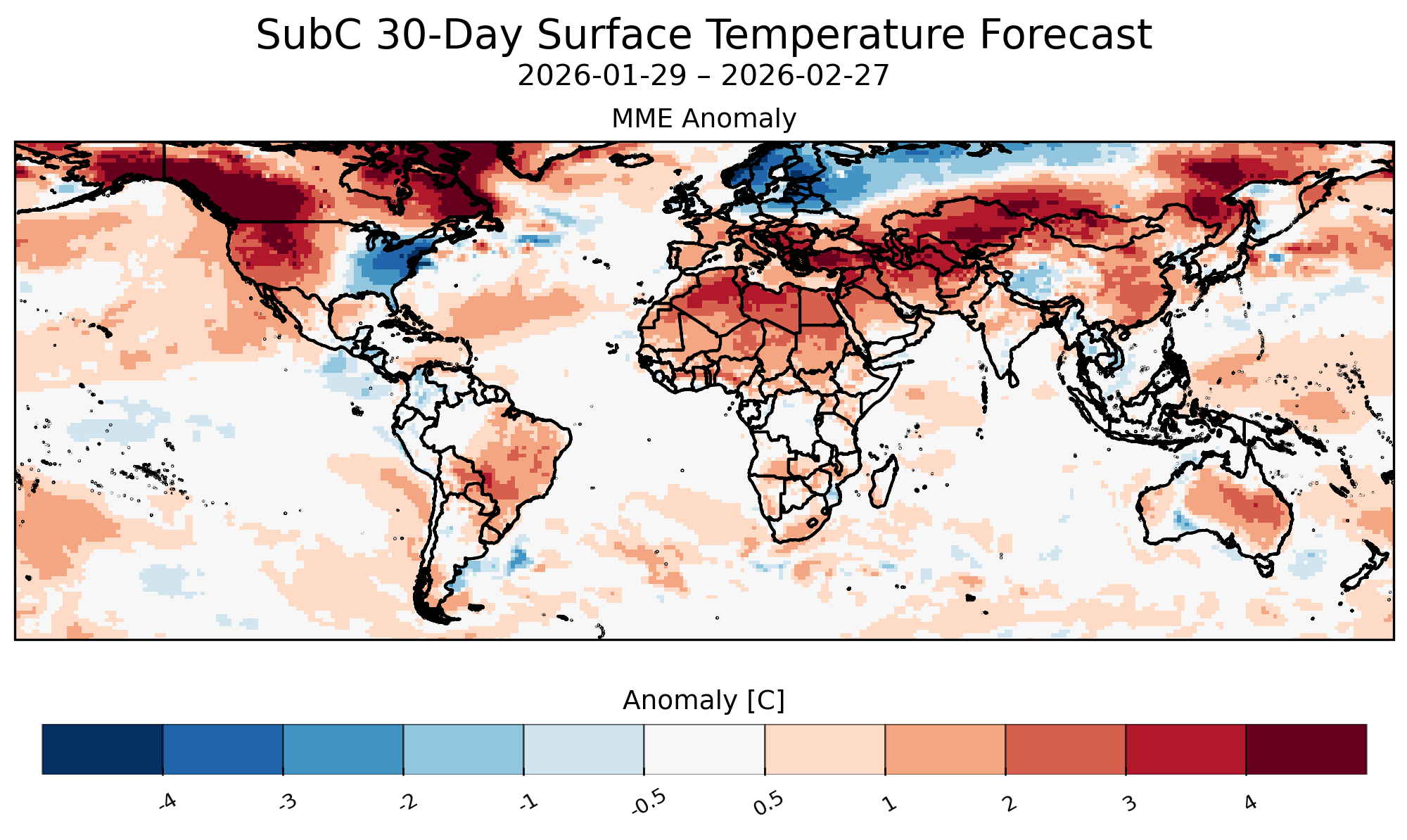 Maximum temperature forecast anomaly for the next 30 days starting on 29 January 2026, from four Subseasonal Consortium (SubC) models. SubC data accessed from the IRI Data Library. Map source: UCSB Climate Hazards Center.