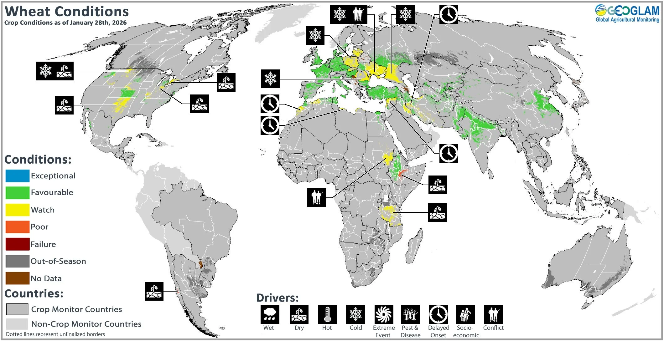 Wheat crop conditions over the main growing areas are based upon a combination of national and regional crop analyst inputs, along with earth observation data. Conditions are based upon information as of January 28th.