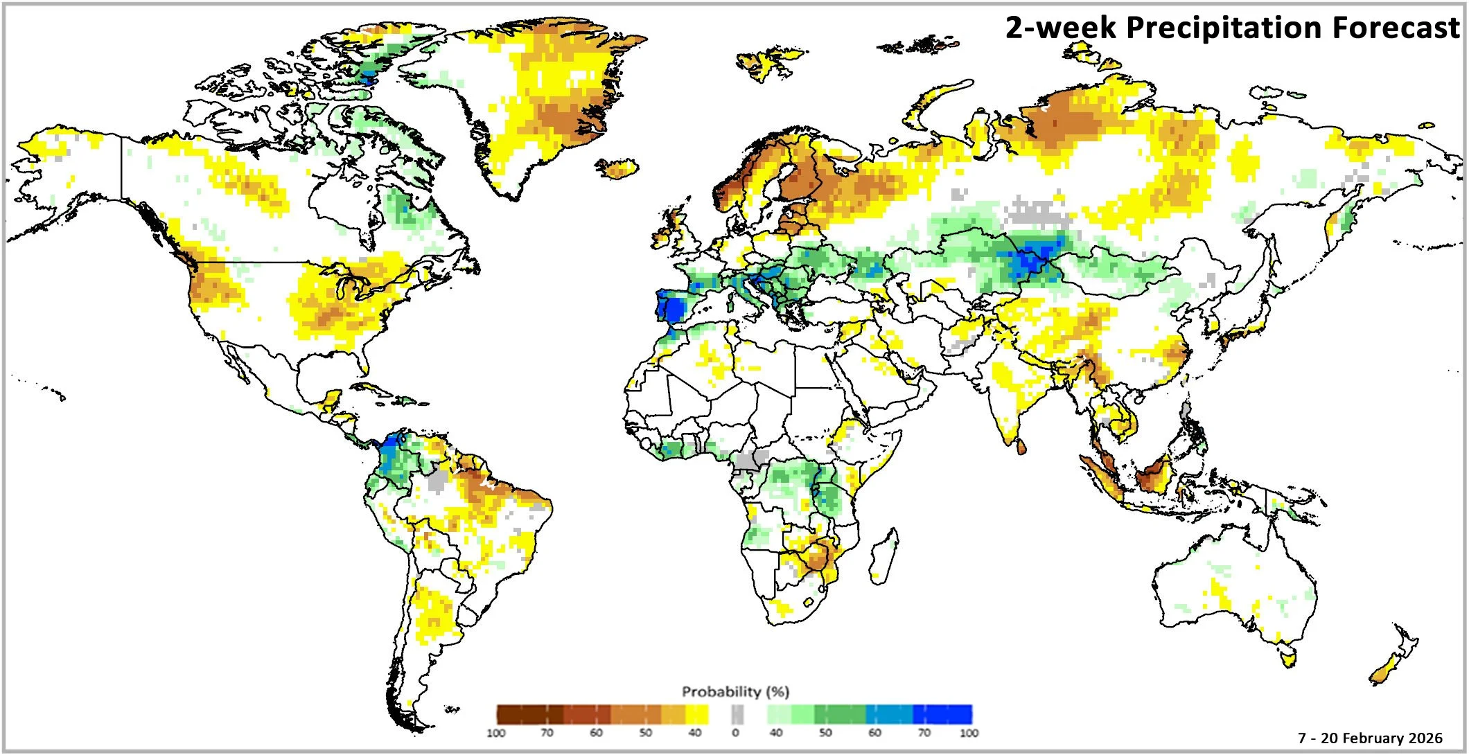 Figure 1: IRI SubX Precipitation Biweekly Probability Forecast for 7 – 20 February, issued on 30 January 2026. The forecast is based on statistically calibrated tercile category forecasts from three SubX models. Source: IRI Subseasonal Forecasts Maproom