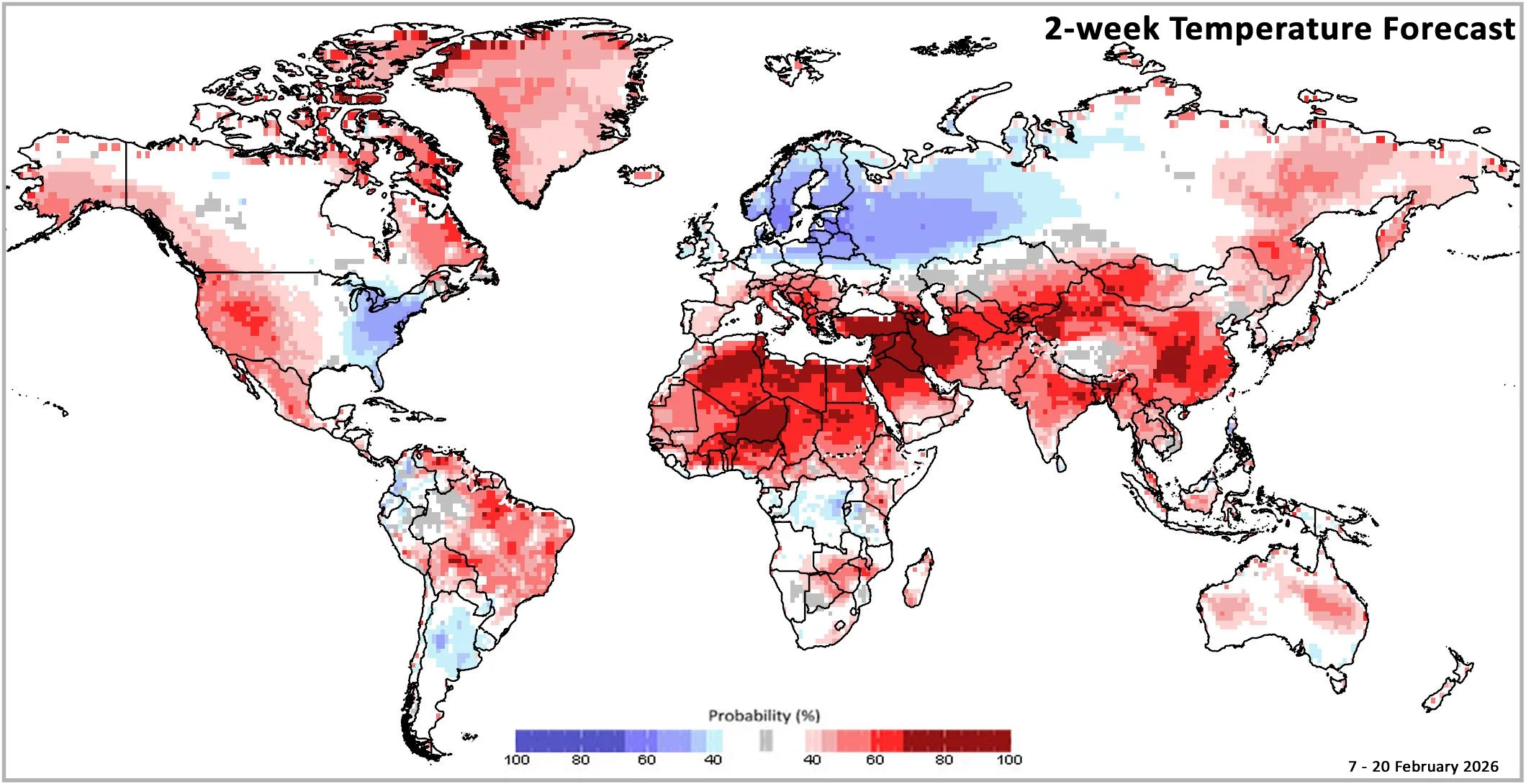 In Australia, where extreme heat occurred during January, February is also forecast to be abnormally hot. February temperatures will likely be warmer than normal in Africa, central and eastern Asia, Brazil, Canada, the Mediterranean, the Middle East, northern Mexico, and the western United States. Abnormally cold conditions are forecast in northern and eastern Europe, western Russia, and the eastern United States during February. Extreme cold weather also impacted these regions during January.