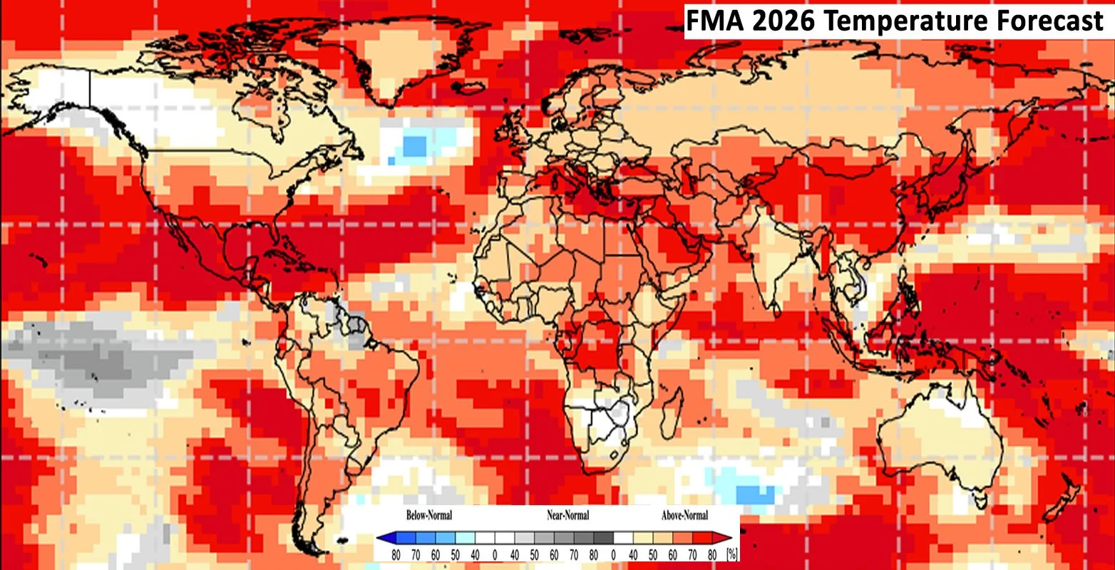 Figure 4: Based on January conditions, a probability forecast for the most likely February-March-April (FMA) 2026 temperature tercile. The white colour indicates that there is no dominant category across the model forecasts. Source: WMO Lead Centre for Long-Range Forecast Multi-Model Ensemble