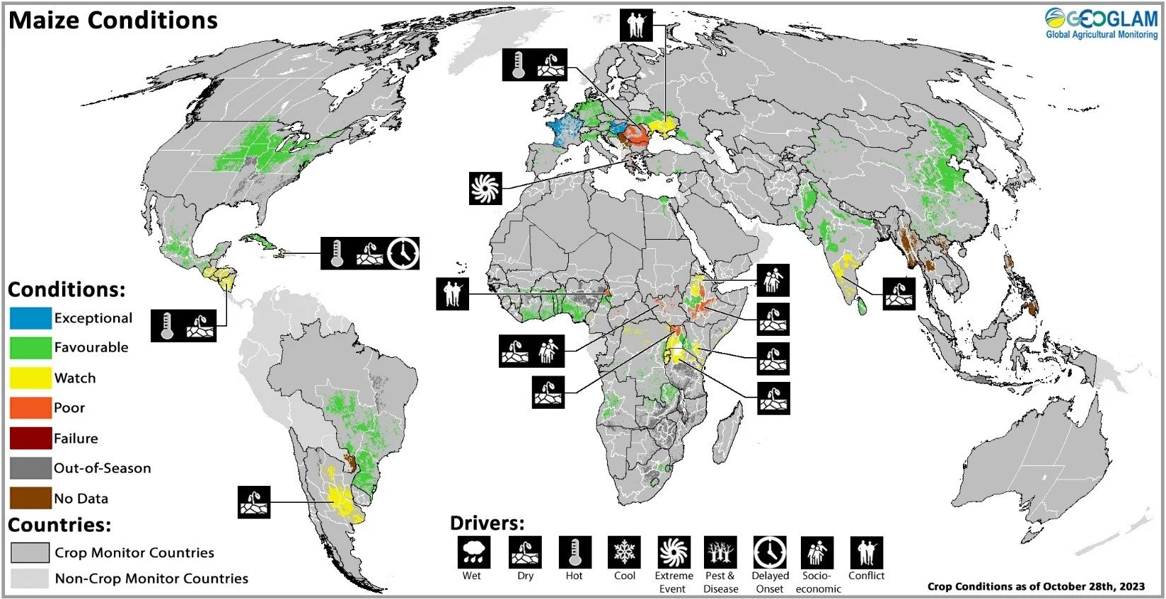 Maize crop conditions over main growing areas are based upon a combination of national and regional crop analyst inputs along with earth observation data. Conditions are based upon information as of October 28th.