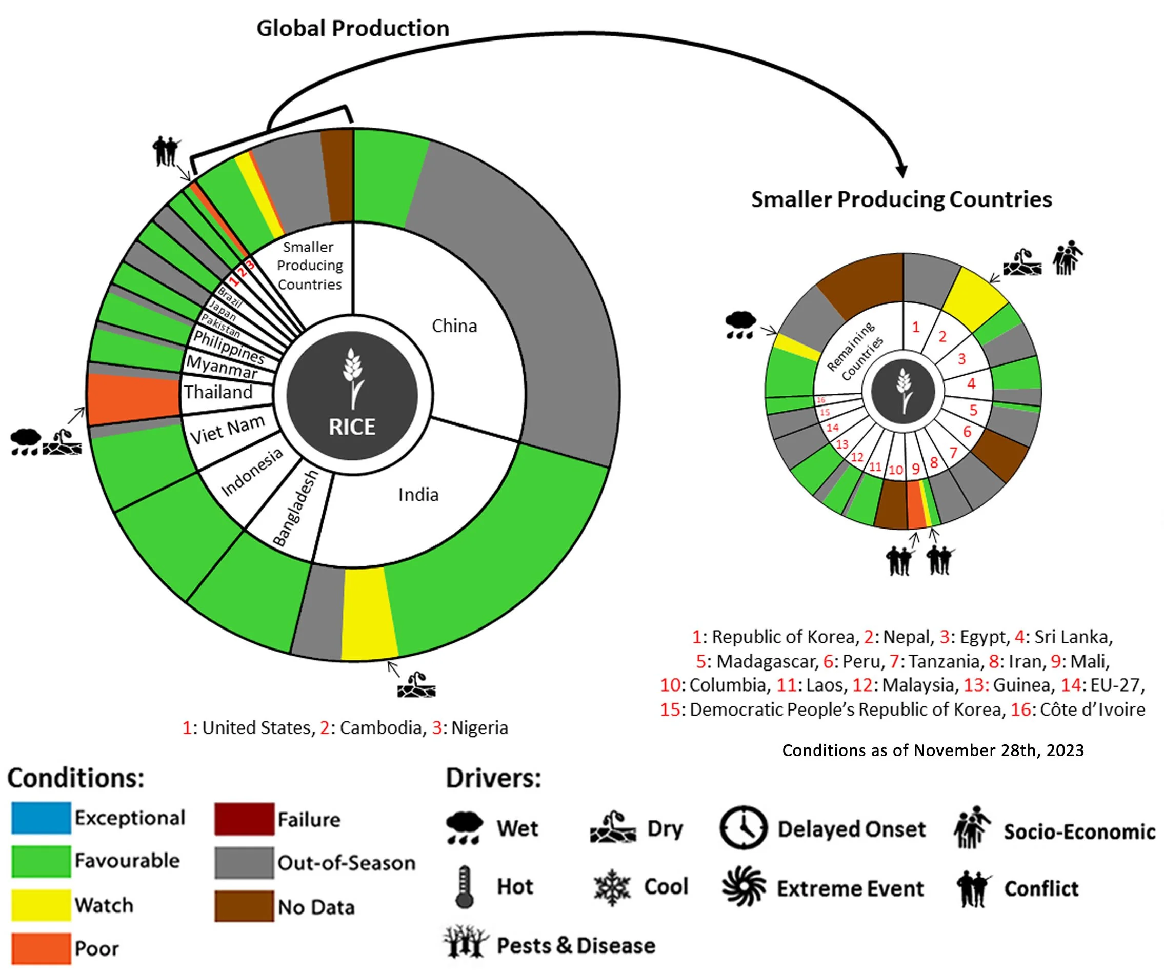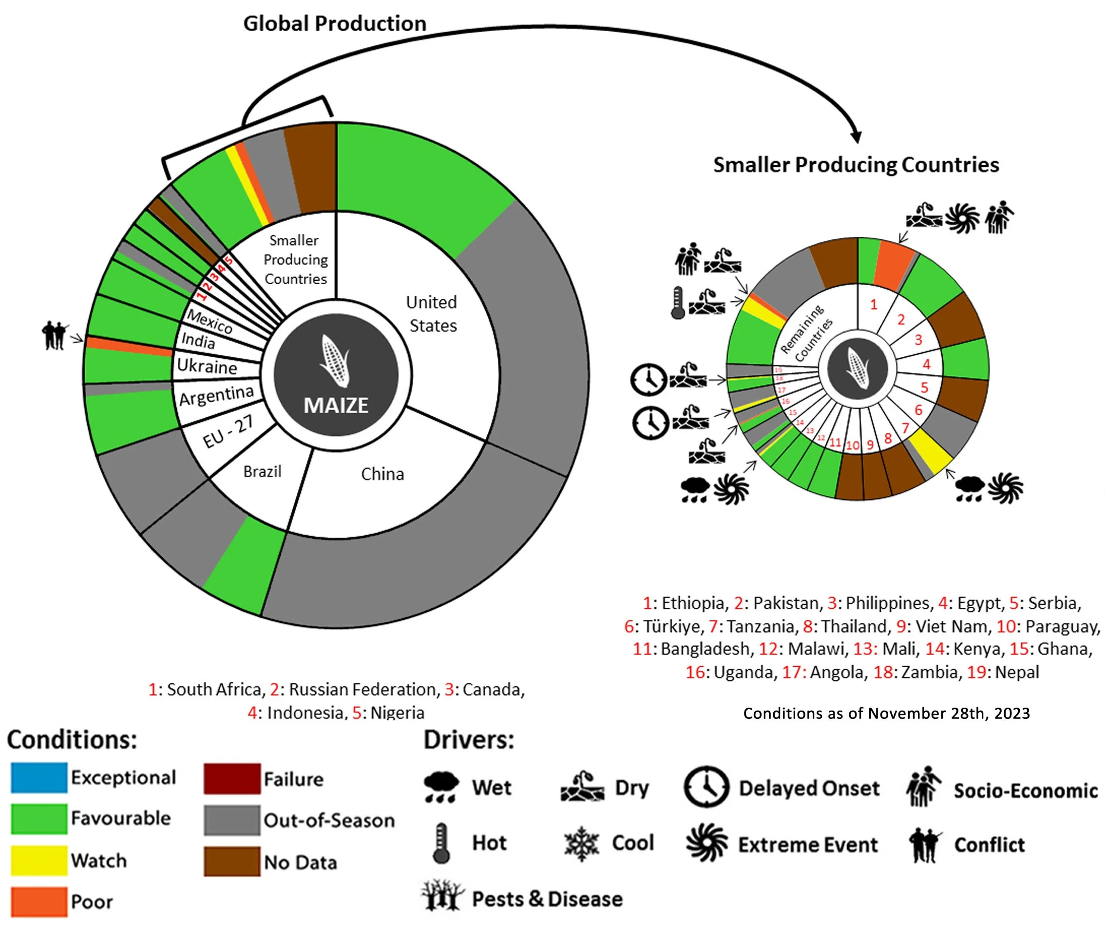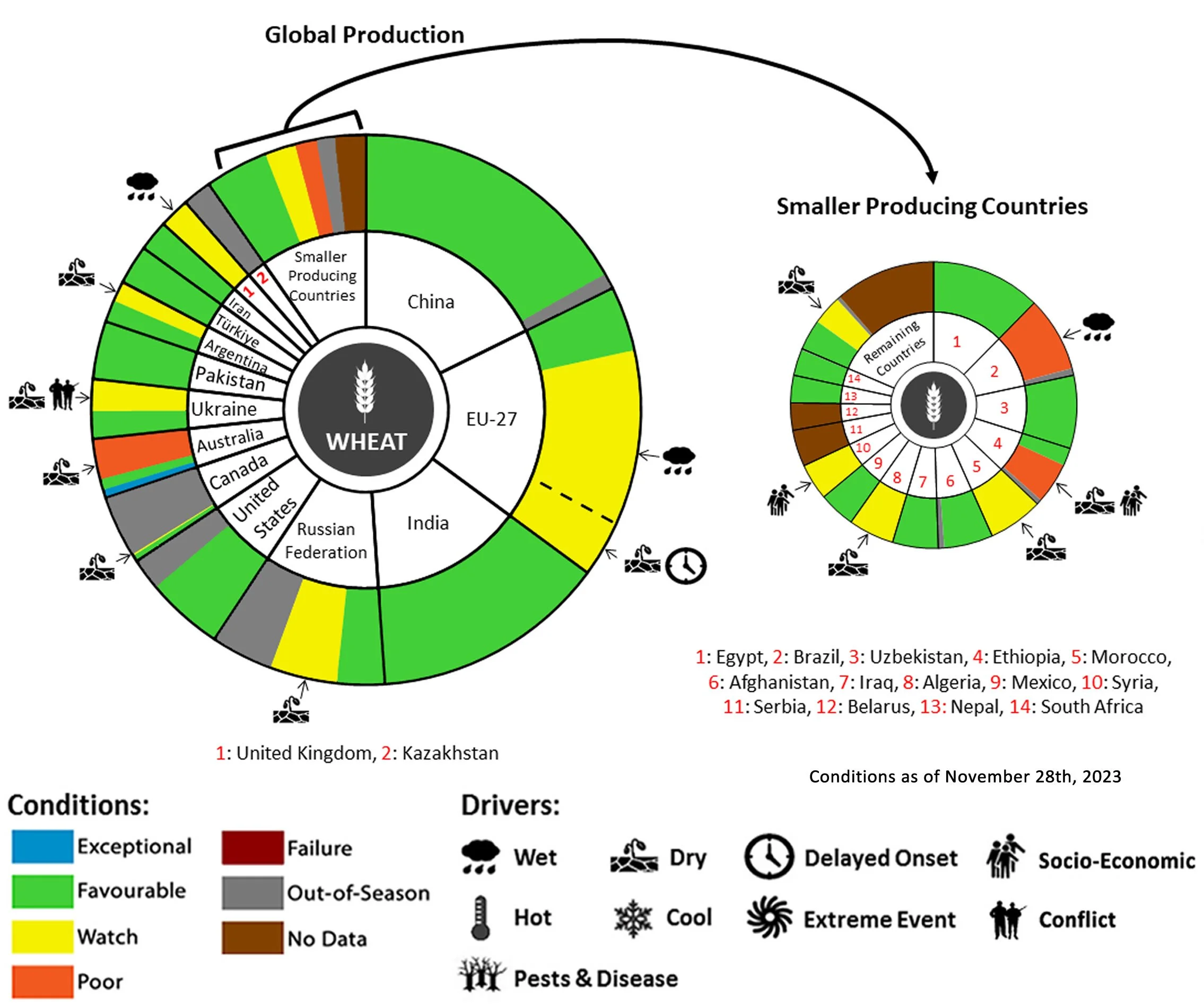Pie Chart Description: Each slice represents a country's share of total Global production (5-year average). Main producing countries (representing 90-95 percent of production) are shown individually, with the remaining 5-10 percent grouped into the “Smaller Producing Countries” category. The proportion within each national slice is coloured according to the crop conditions within a specific growing area; grey indicates that the respective area is out of season. Sections within each slide are weighted by the sub-national production statistics (5-year average) of the respective country. The section within each national slice also accounts for multiple cropping seasons (e.g., spring and winter wheat). When conditions are other than ‘favourable’, icons are added that provide information