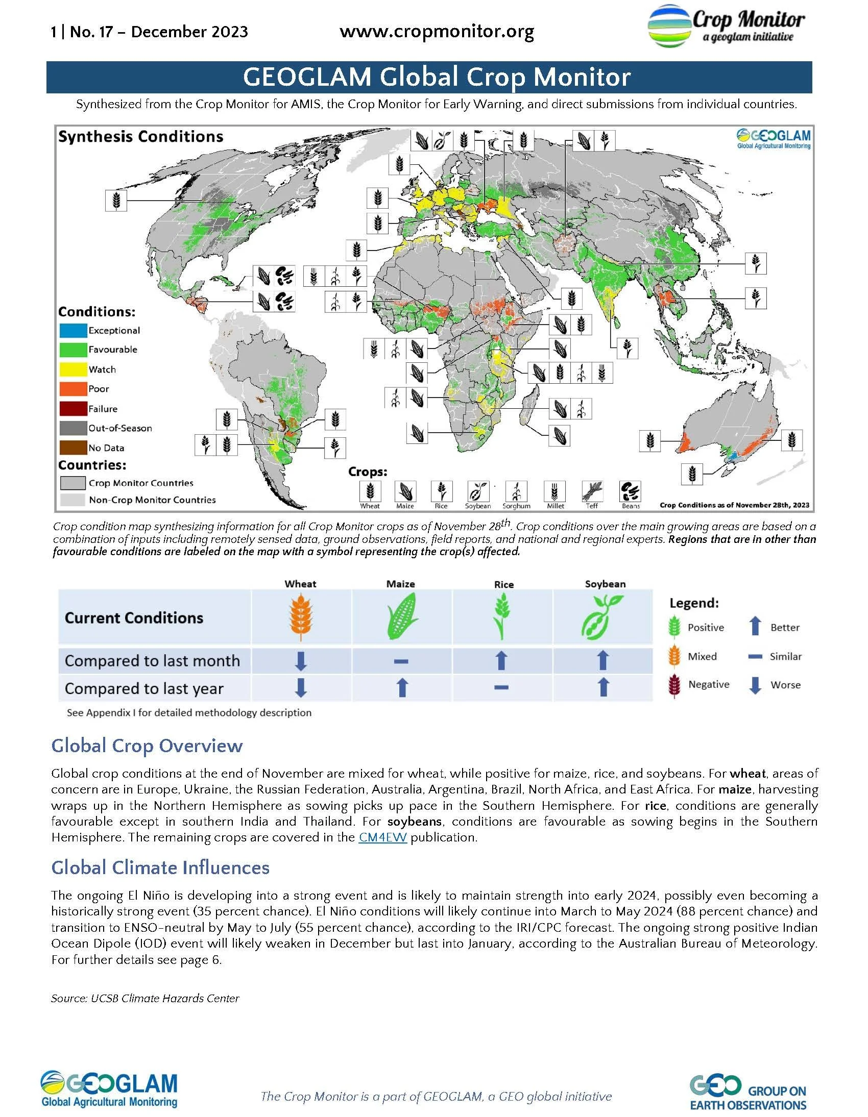 Global crop conditions at the end of November are mixed for wheat, while positive for maize, rice, and soybeans. For wheat, areas of concern are in Europe, Ukraine, the Russian Federation, Australia, Argentina, Brazil, North Africa, and East Africa. For maize, harvesting wraps up in the Northern Hemisphere as sowing picks up pace in the Southern Hemisphere. For rice, conditions are generally favourable except in southern India and Thailand. For soybeans, conditions are favourable as sowing begins in the Southern Hemisphere. The remaining crops are covered in the CM4EW publication.
