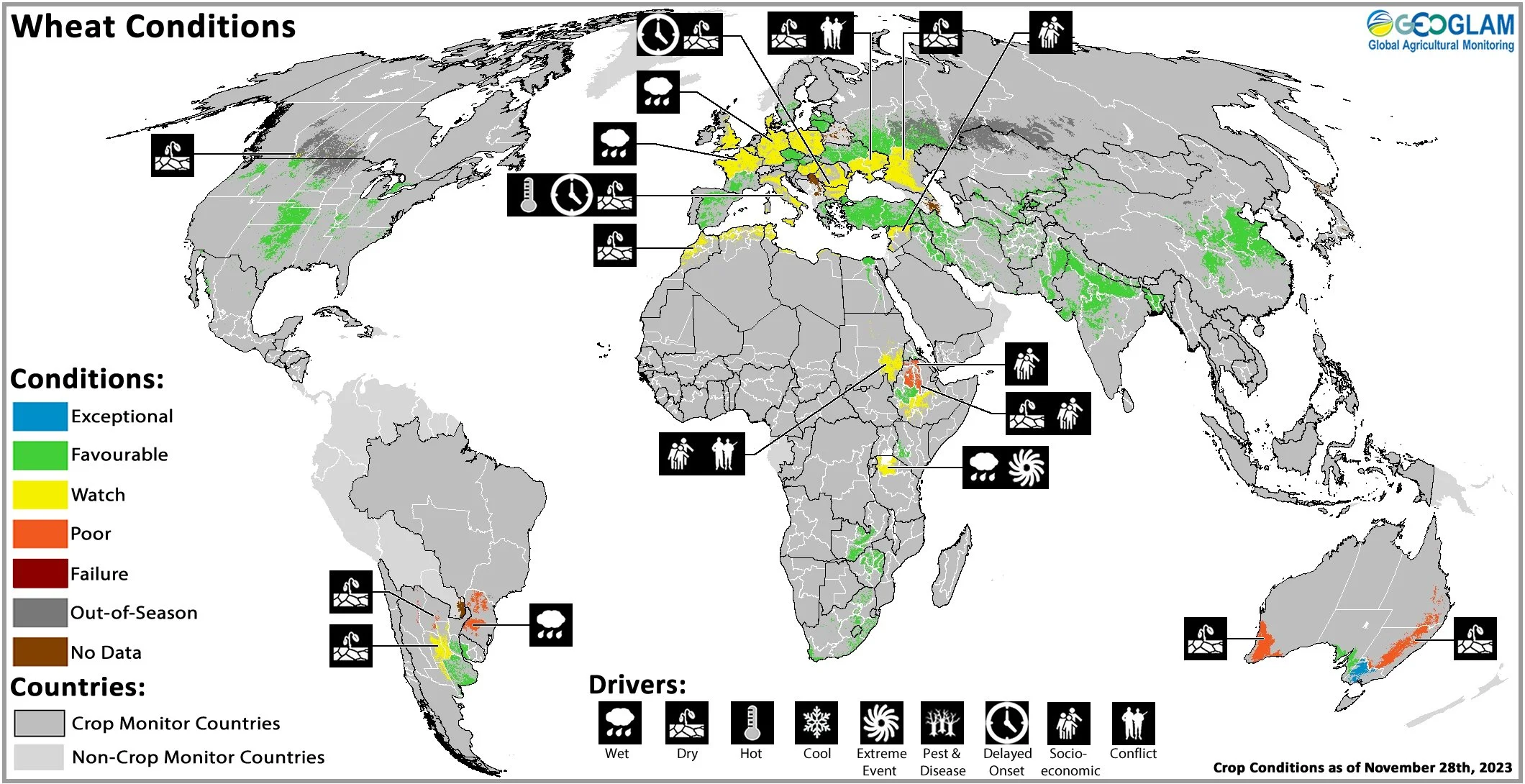 Wheat crop conditions over main growing areas are based upon a combination of national and regional crop analyst inputs along with earth observation data. Conditions are based upon information as of November 28th.