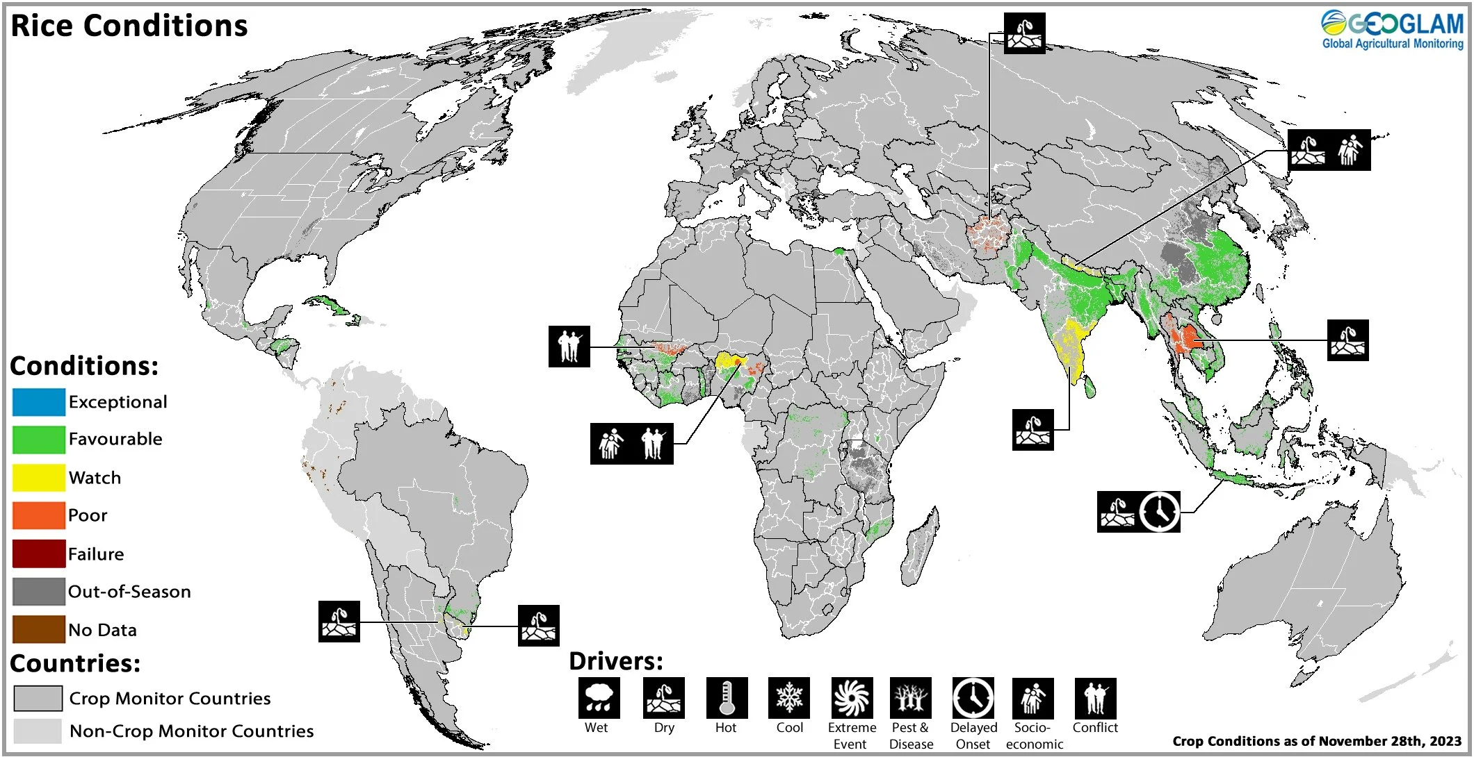 Rice crop conditions over main growing areas are based upon a combination of national and regional crop analyst inputs along with earth observation data. Conditions are based upon information as of November 28th.