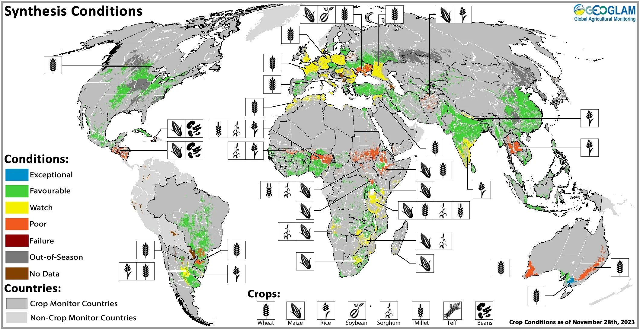 Crop condition map synthesizing information for all Crop Monitor crops as of November 28th. Crop conditions over the main growing areas are based on a combination of inputs including remotely sensed data, ground observations, field reports, and national and regional experts. Regions that are in other than favourable conditions are labeled on the map with a symbol representing the crop(s) affected.