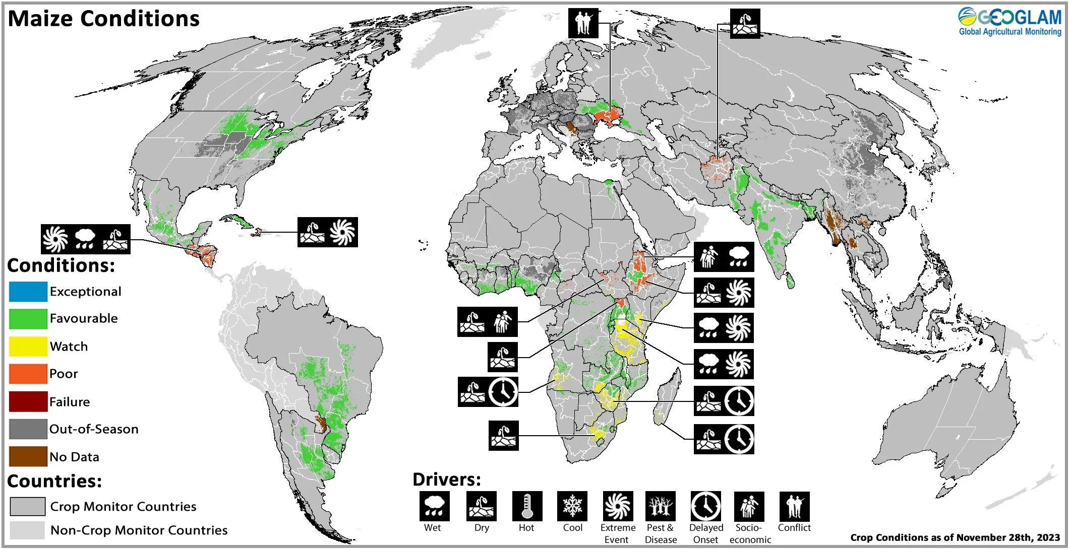 Maize crop conditions over main growing areas are based upon a combination of national and regional crop analyst inputs along with earth observation data. Conditions are based upon information as of November 28th.