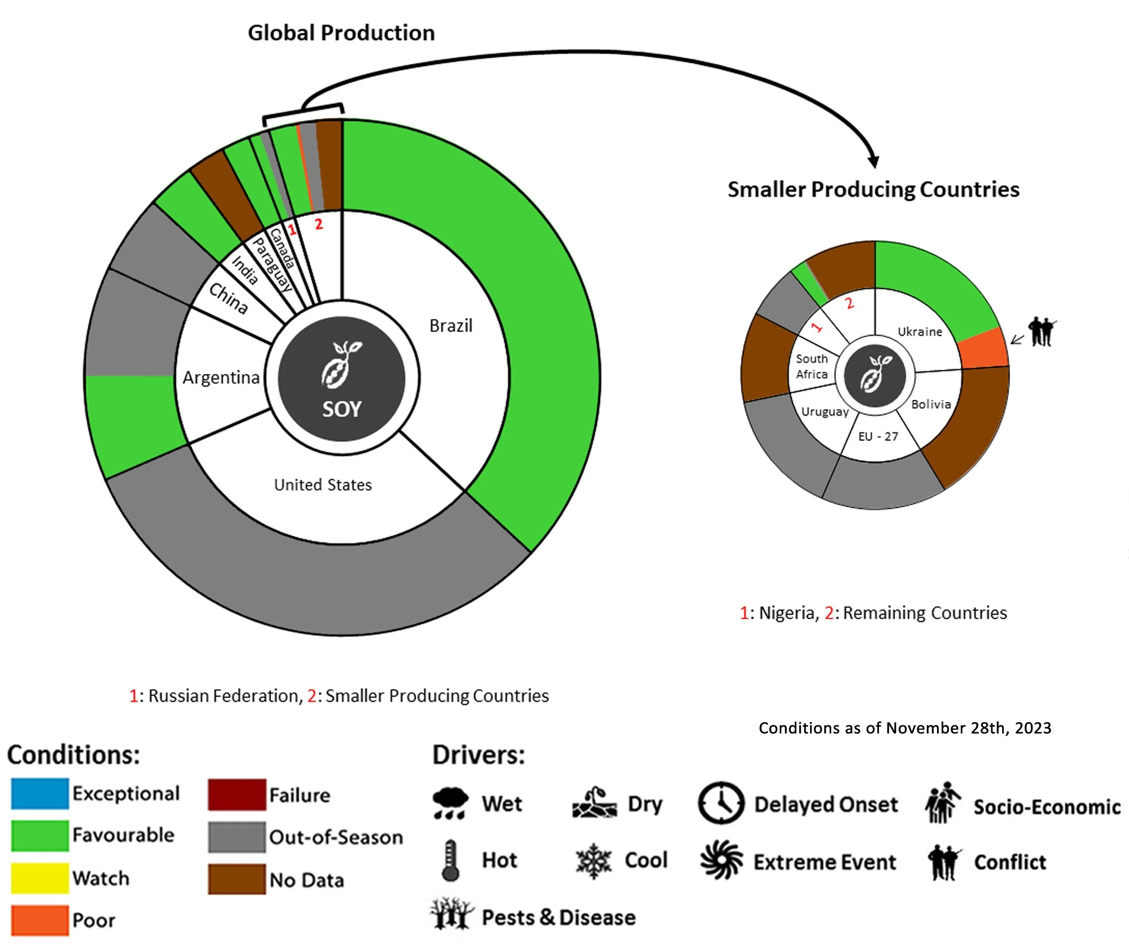 Soybean crop conditions over main growing areas are based upon a combination of national and regional crop analyst inputs along with earth observation data. Conditions are based upon information as of November 28th.