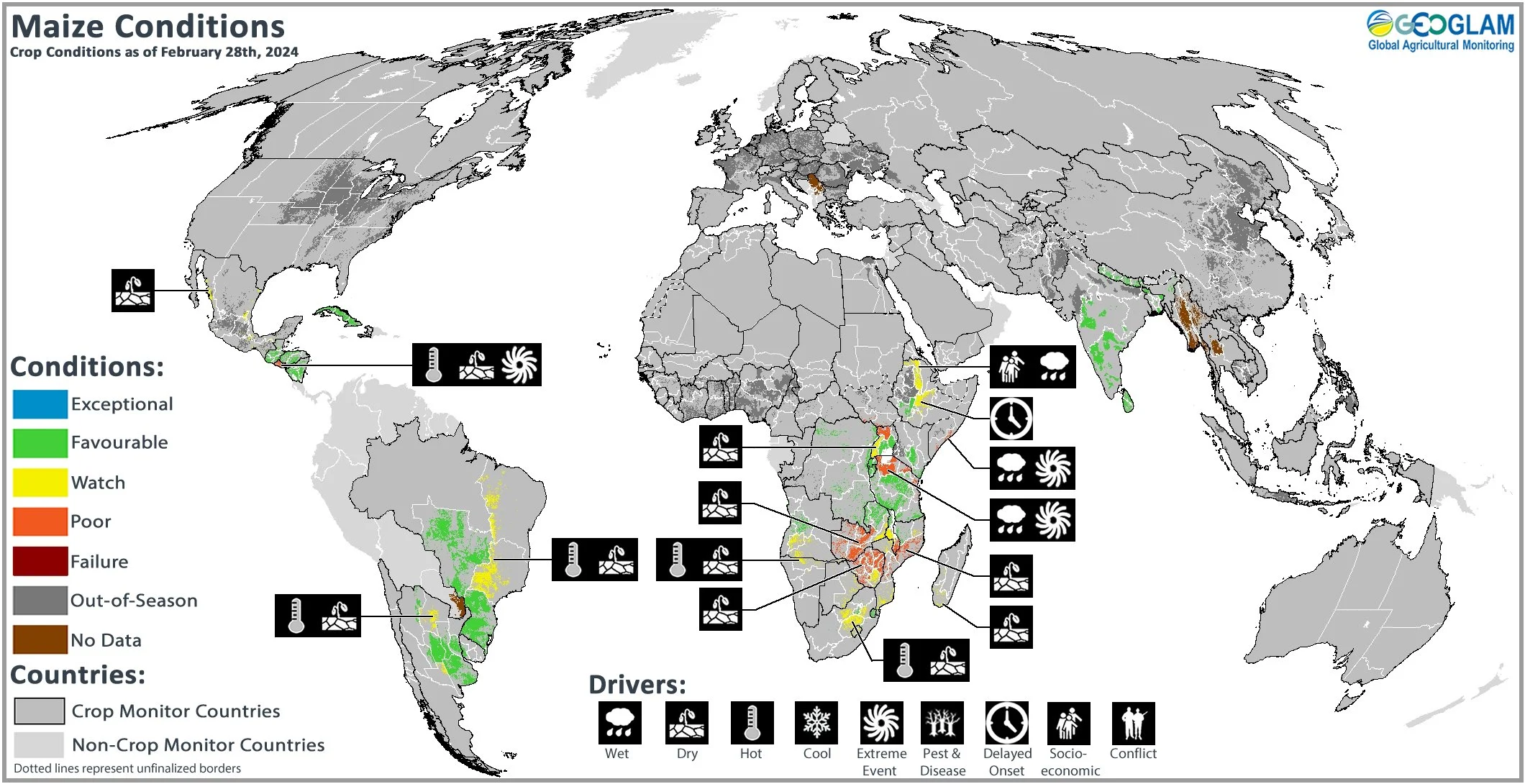 Maize crop conditions over main growing areas are based upon a combination of national and regional crop analyst inputs along with earth observation data. Conditions are based upon information as of February 28th.