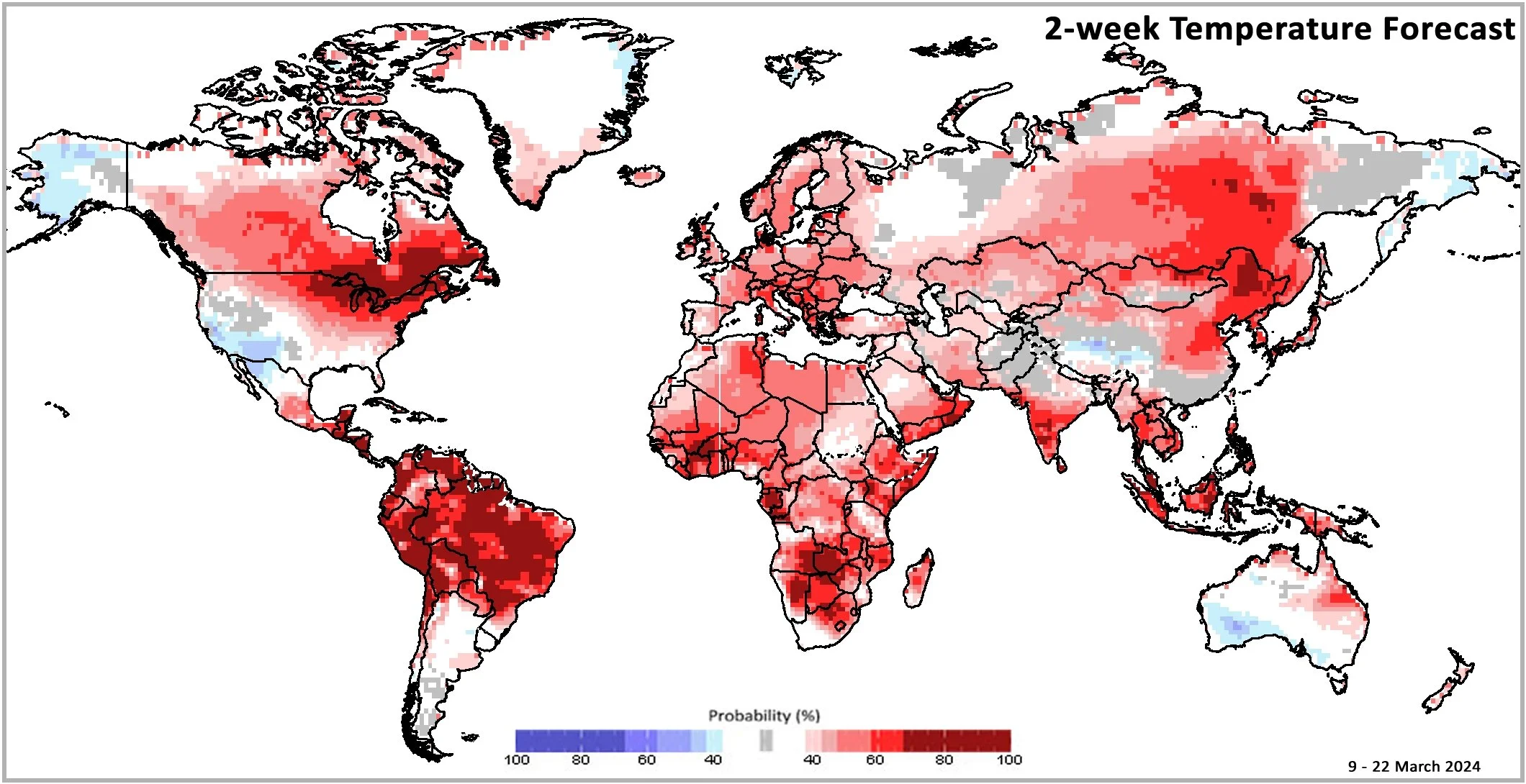 Figure 2: IRI SubX Temperature Biweekly Probability Forecast for 9 – 22 March 2024, issued on 1 March 2024. The forecast is based on statistically calibrated tercile category forecasts from three SubX models. Source: IRI Subseasonal Forecasts Maproom