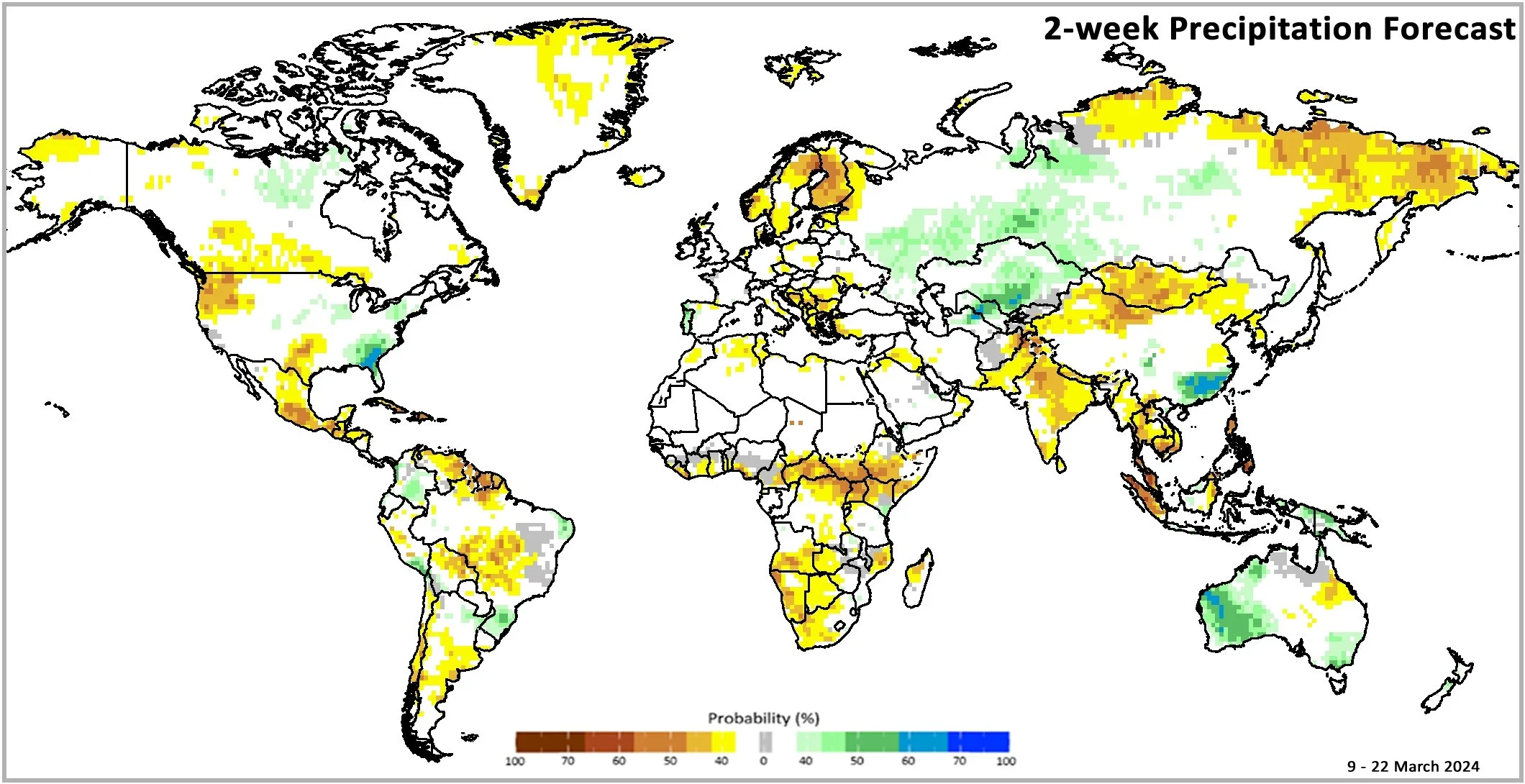 Figure 1: IRI SubX Precipitation Biweekly Probability Forecast for 9 – 22 March 2024, issued on 1 March 2024. The forecast is based on statistically calibrated tercile category forecasts from three SubX models. Source: IRI Subseasonal Forecasts Maproom