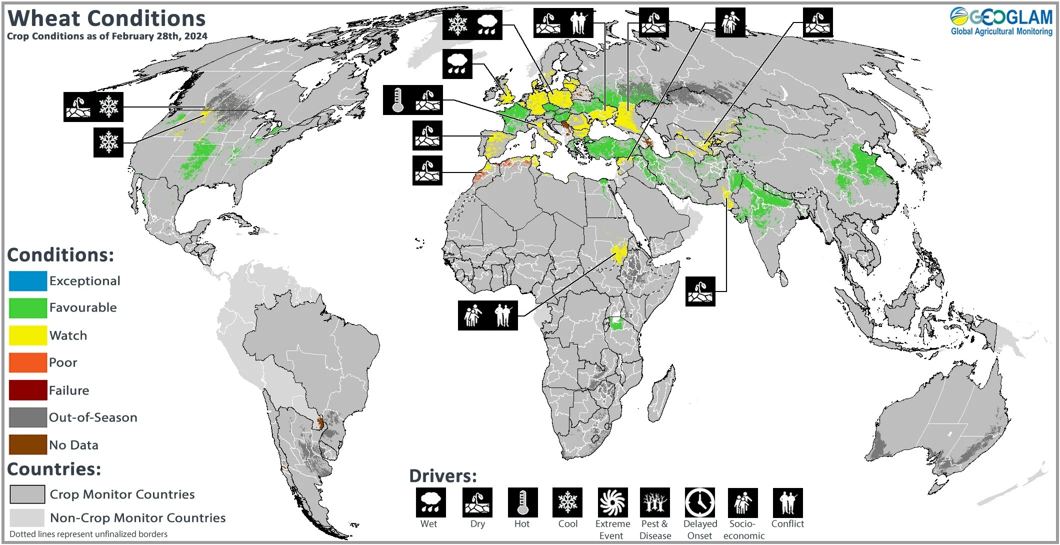 Crop condition map synthesizing information for all Crop Monitor crops as of February 28th. Crop conditions over the main growing areas are based on a combination of inputs including remotely sensed data, ground observations, field reports, and national and regional experts. Regions that are in other than favourable conditions are labeled on the map with a symbol representing the crop(s) affected.