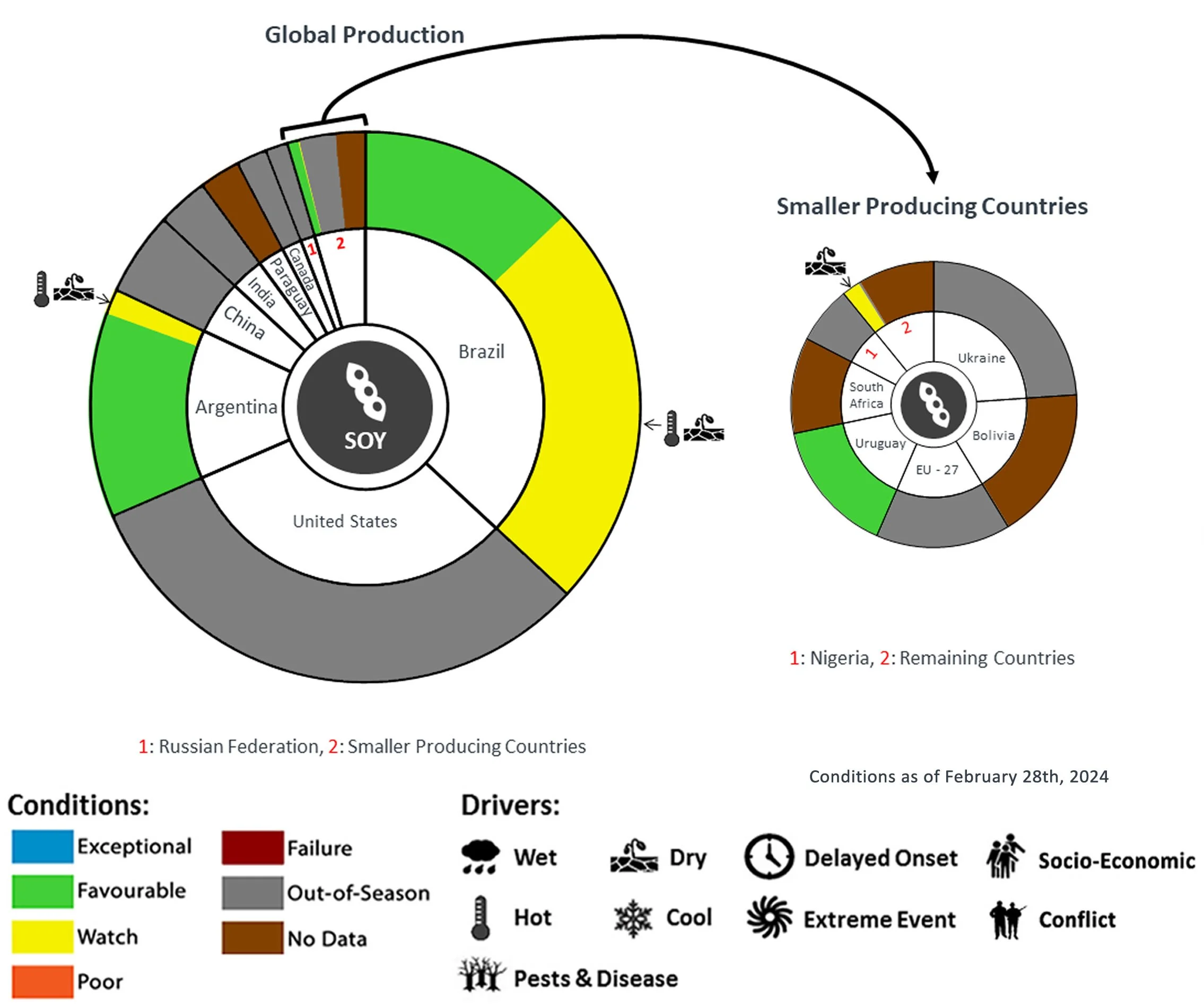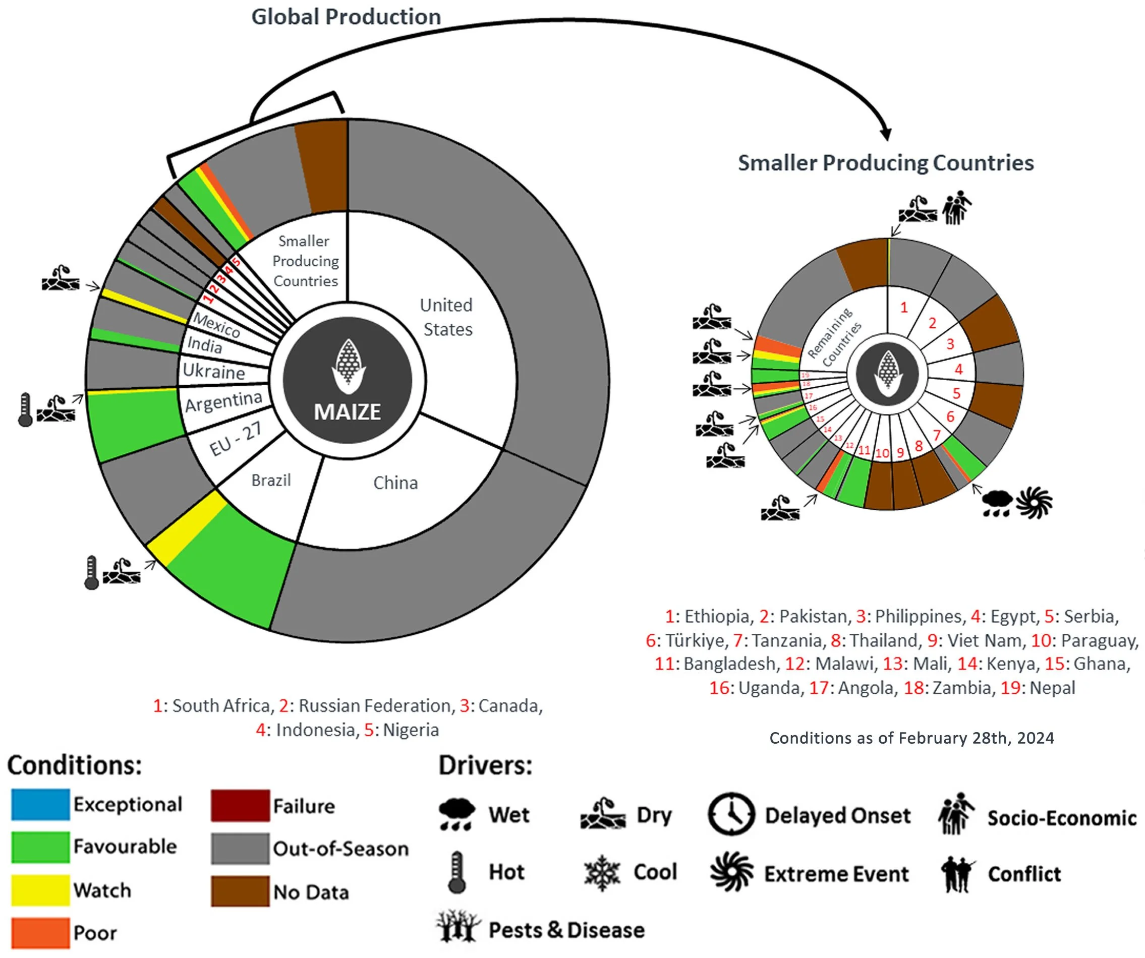 Pie Chart Description: Each slice represents a country's share of total Global production (5-year average). Main producing countries (representing 90-95 percent of production) are shown individually, with the remaining 5-10 percent grouped into the “Smaller Producing Countries” category. The proportion within each national slice is coloured according to the crop conditions within a specific growing area; grey indicates that the respective area is out of season. Sections within each slide are weighted by the sub-national production statistics (5-year average) of the respective country. The section within each national slice also accounts for multiple cropping seasons (e.g., spring and winter wheat). When conditions are other than ‘favourable’, icons are added that provide information on the key climatic drivers affecting conditions.