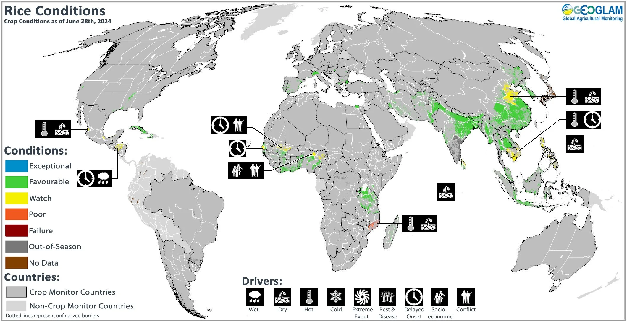 Rice crop conditions over main growing areas are based upon a combination of national and regional crop analyst inputs along with earth observation data. Conditions are based upon information as of June 28th.