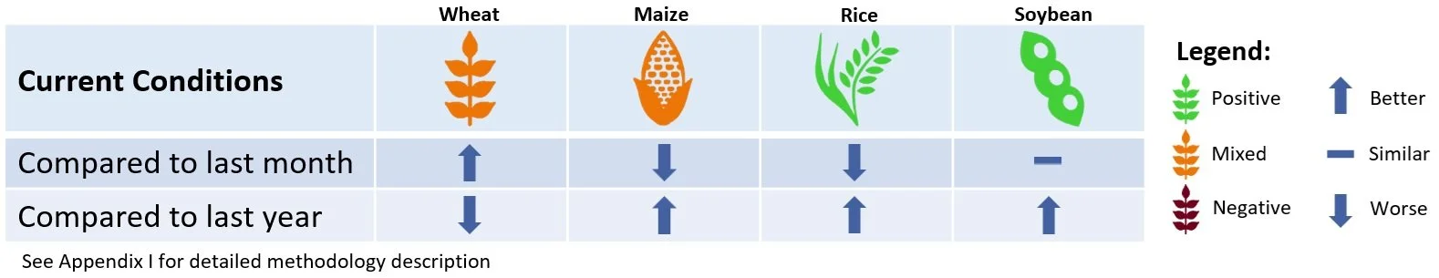 Global crop conditions at the end of June are favourable for rice and soybeans, while mixed for wheat and maize. For wheat, areas of concern remain in parts of North America, Europe, North & East Africa, Central Asia, and Australia. For maize, areas of concern remain in South America, China, Central America, Africa, and parts of Europe. For rice, conditions are generally favourable except for in parts of China, Southeast Asia, Central America, and parts of West Africa. For soybeans, conditions are generally favourable except in parts of China, Ukraine, and the Russian Federation. The remaining crops are covered in the CM4EW publication.