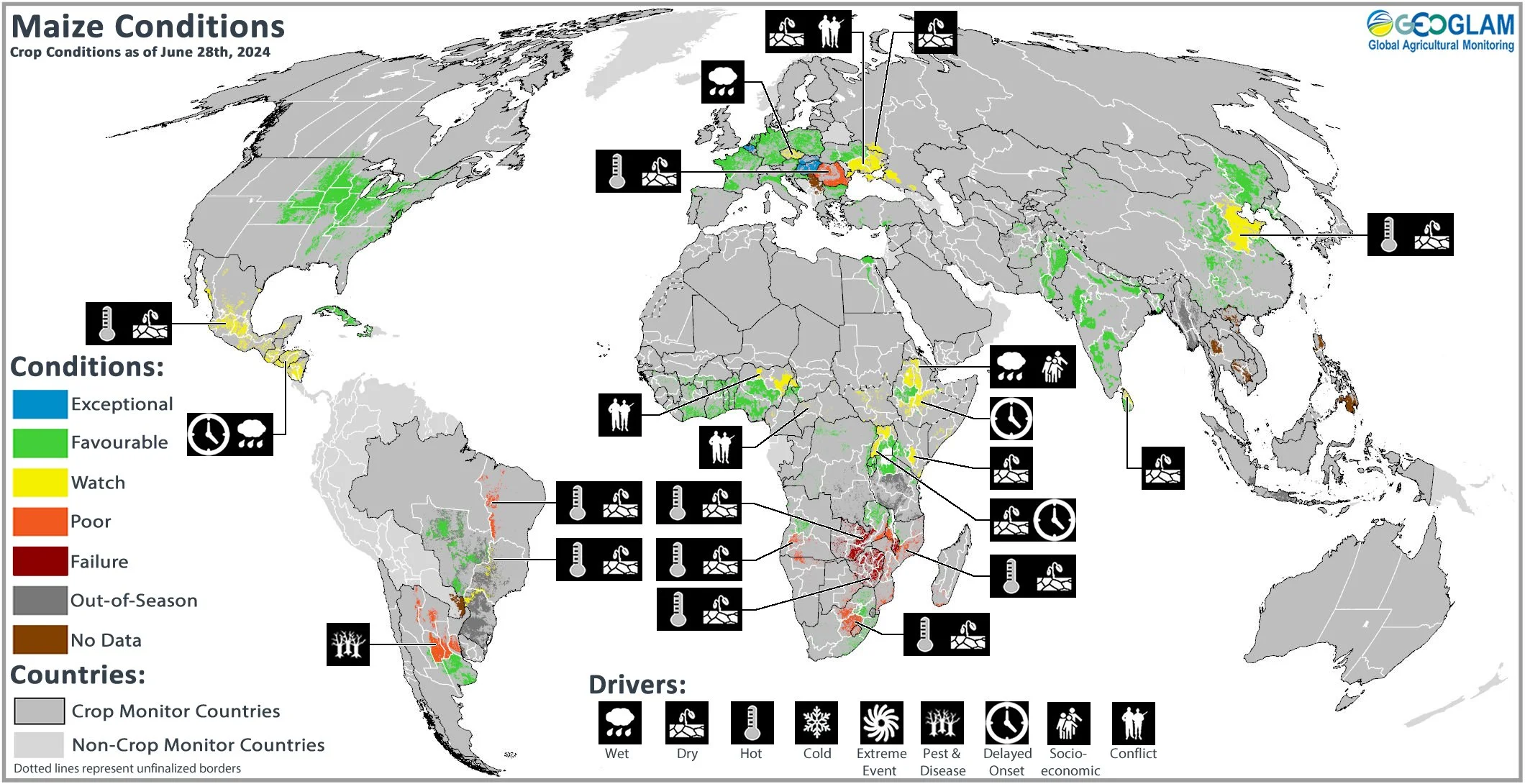 Maize crop conditions over main growing areas are based upon a combination of national and regional crop analyst inputs along with earth observation data. Conditions are based upon information as of June 28th.