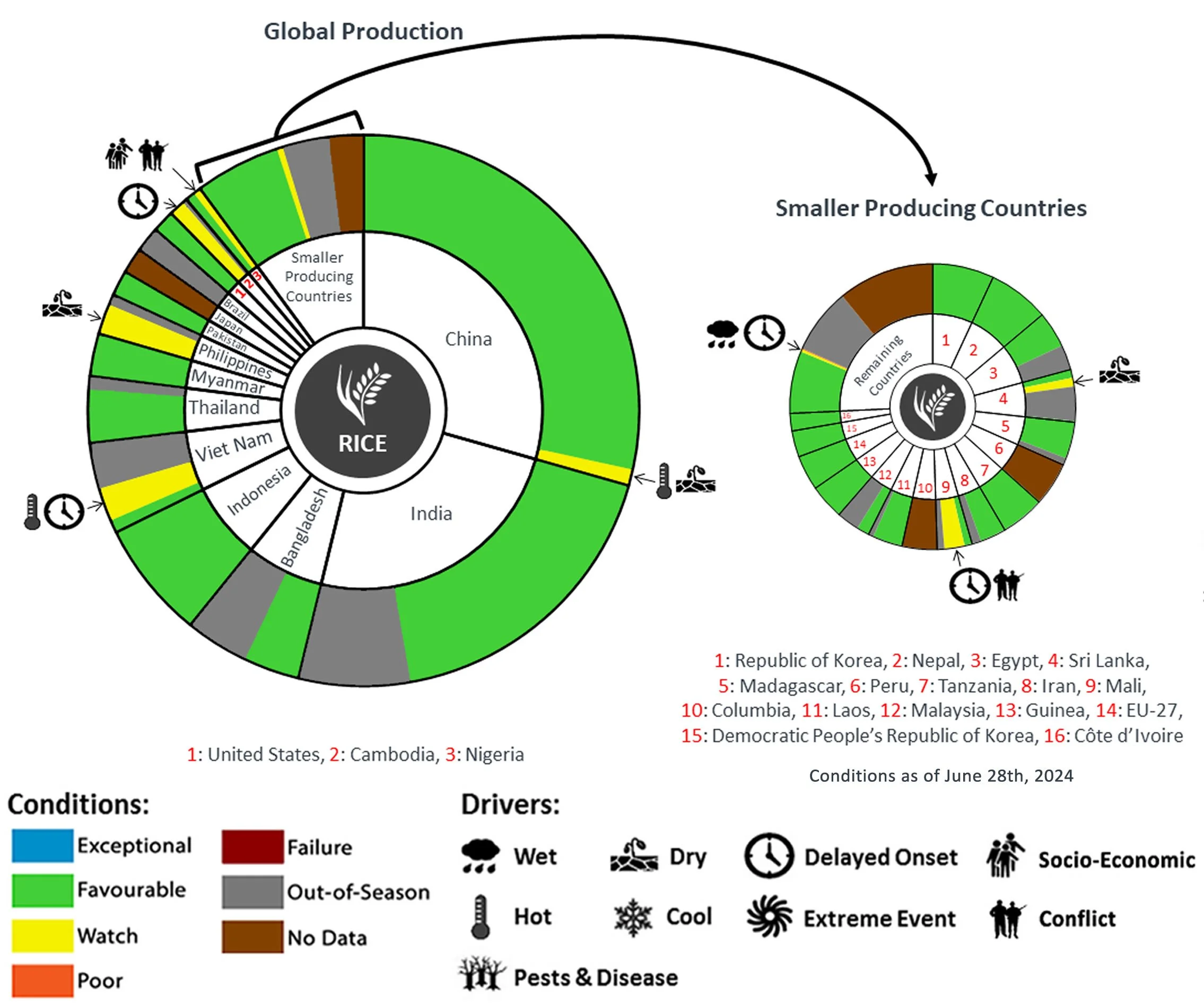 Pie Chart Description: Each slice represents a country's share of total Global production (5-year average). Main producing countries (representing 90-95 percent of production) are shown individually, with the remaining 5-10 percent grouped into the “Smaller Producing Countries” category. The proportion within each national slice is coloured according to the crop conditions within a specific growing area; grey indicates that the respective area is out of season. Sections within each slide are weighted by the sub-national production statistics (5-year average) of the respective country. The section within each national slice also accounts for multiple cropping seasons (e.g., spring and winter wheat). When conditions are other than ‘favourable’, icons are added that provide information on the key climatic drivers affecting conditions.