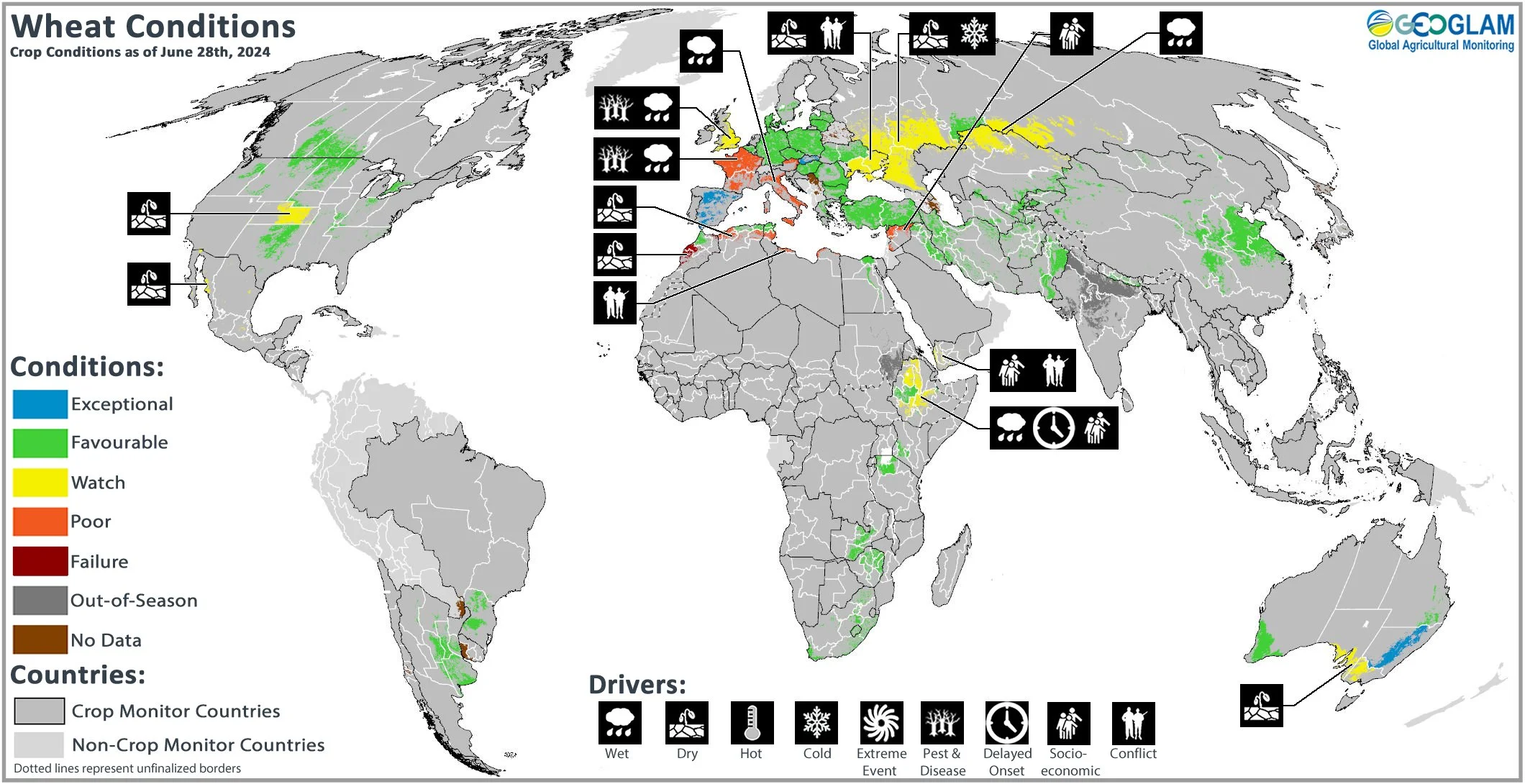 Wheat crop conditions over main growing areas are based upon a combination of national and regional crop analyst inputs along with earth observation data. Conditions are based upon information as of June 28th.