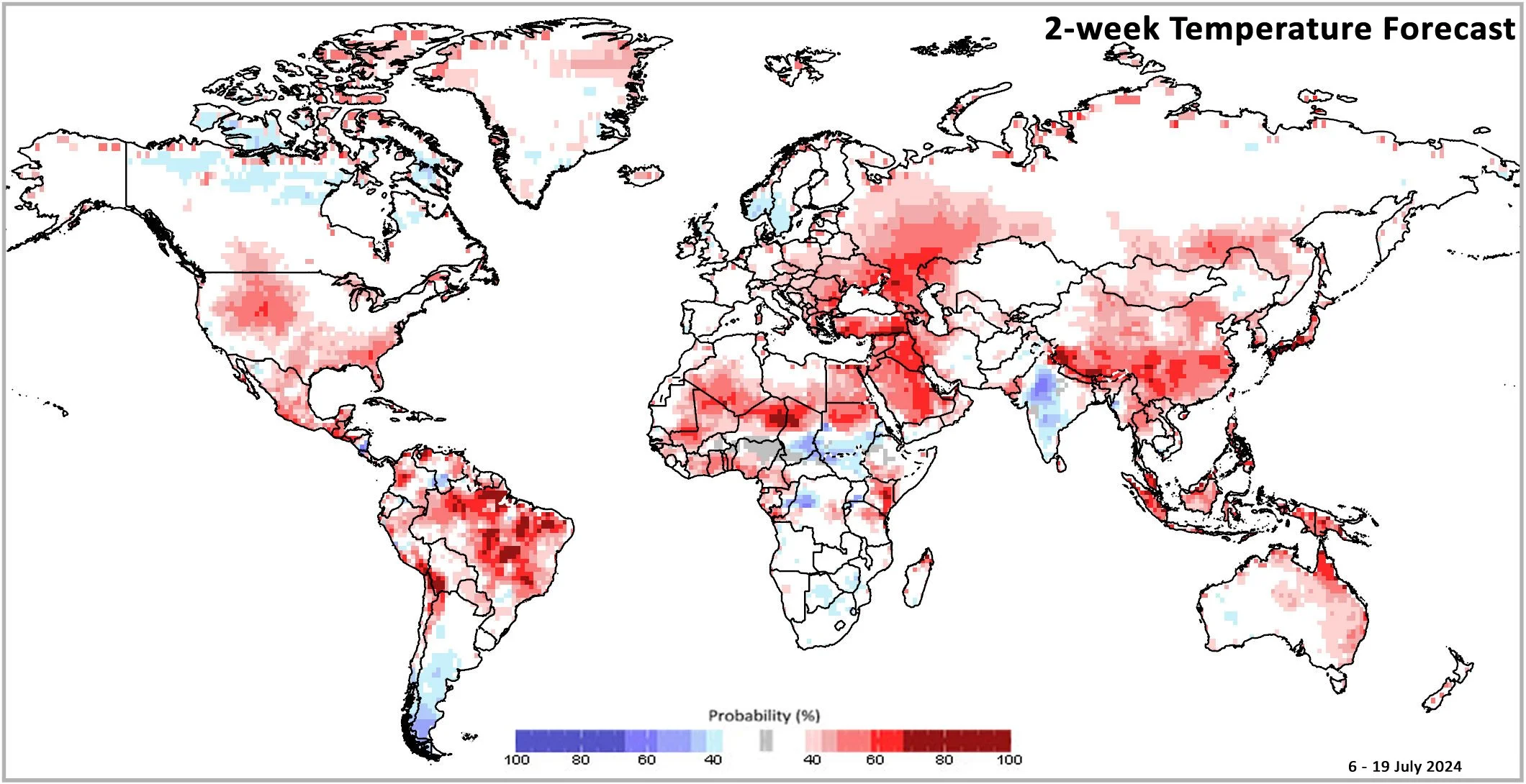 In North America, the two-week forecast (Figures 1 & 2) indicates potential areas of above-average precipitation over the US southwest, while below-average precipitation over the Prairies and western Canada and the Pacific Northwest and southern Great Plains of the US. During the same time, temperatures are likely to be above-average in the Prairies of Canada along with in the western and southeast of the US. The long-term July-August-September 2024 forecast (Figures 3 & 4) shows a leaning toward below-average precipitation over the western US, while leaning towards above-average along the US Gulf and Atlantic coasts. During the same time, temperatures are likely to be above-average across both Canada and the US, except for the West Coast of both countries. For further details, see the CM4AMIS Regional Outlook for the US.