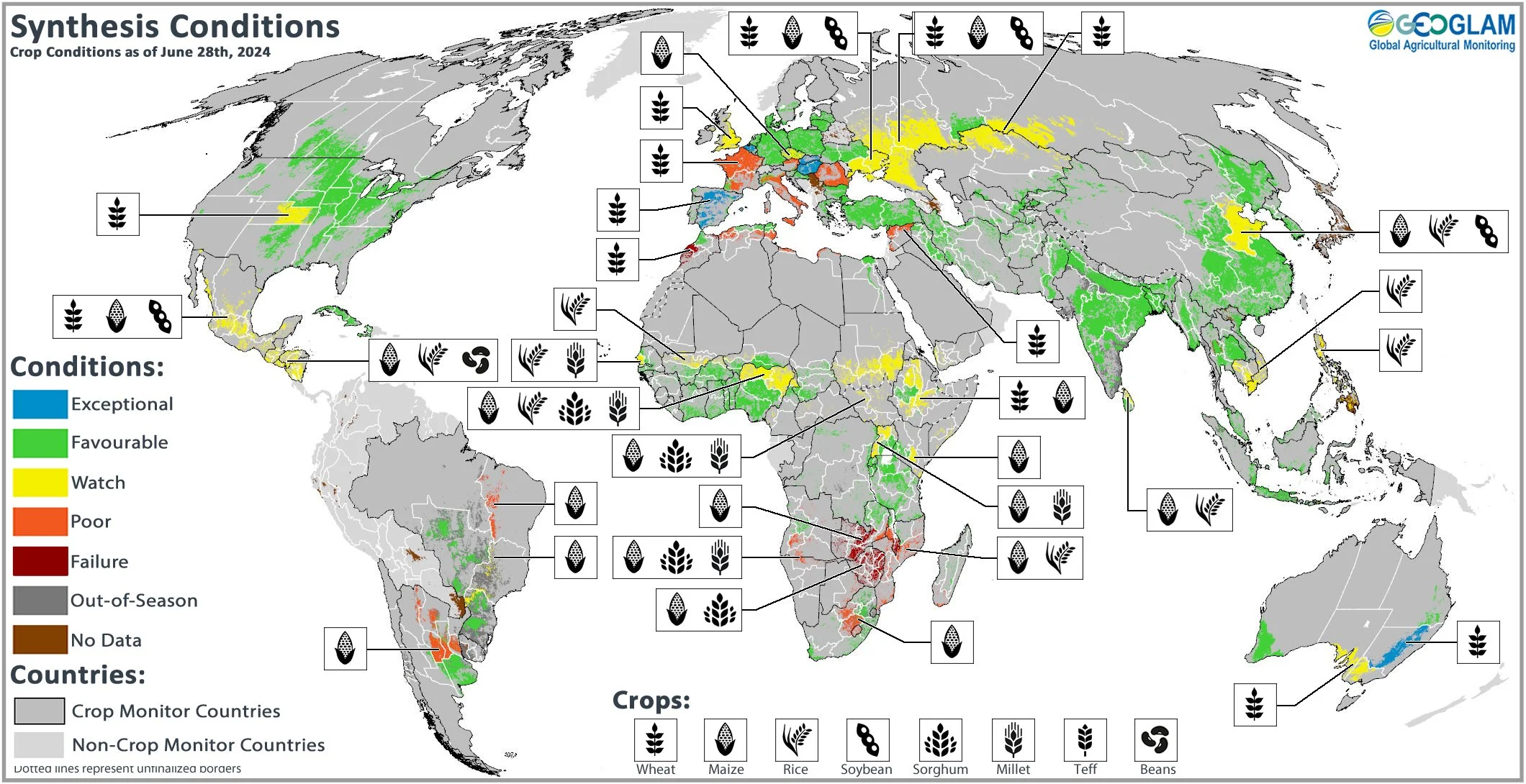 Crop condition map synthesizing information for all Crop Monitor crops as of June 28th. Crop conditions over the main growing areas are based on a combination of inputs including remotely sensed data, ground observations, field reports, and national and regional experts. Regions that are in other than favourable conditions are labeled on the map with a symbol representing the crop(s) affected.