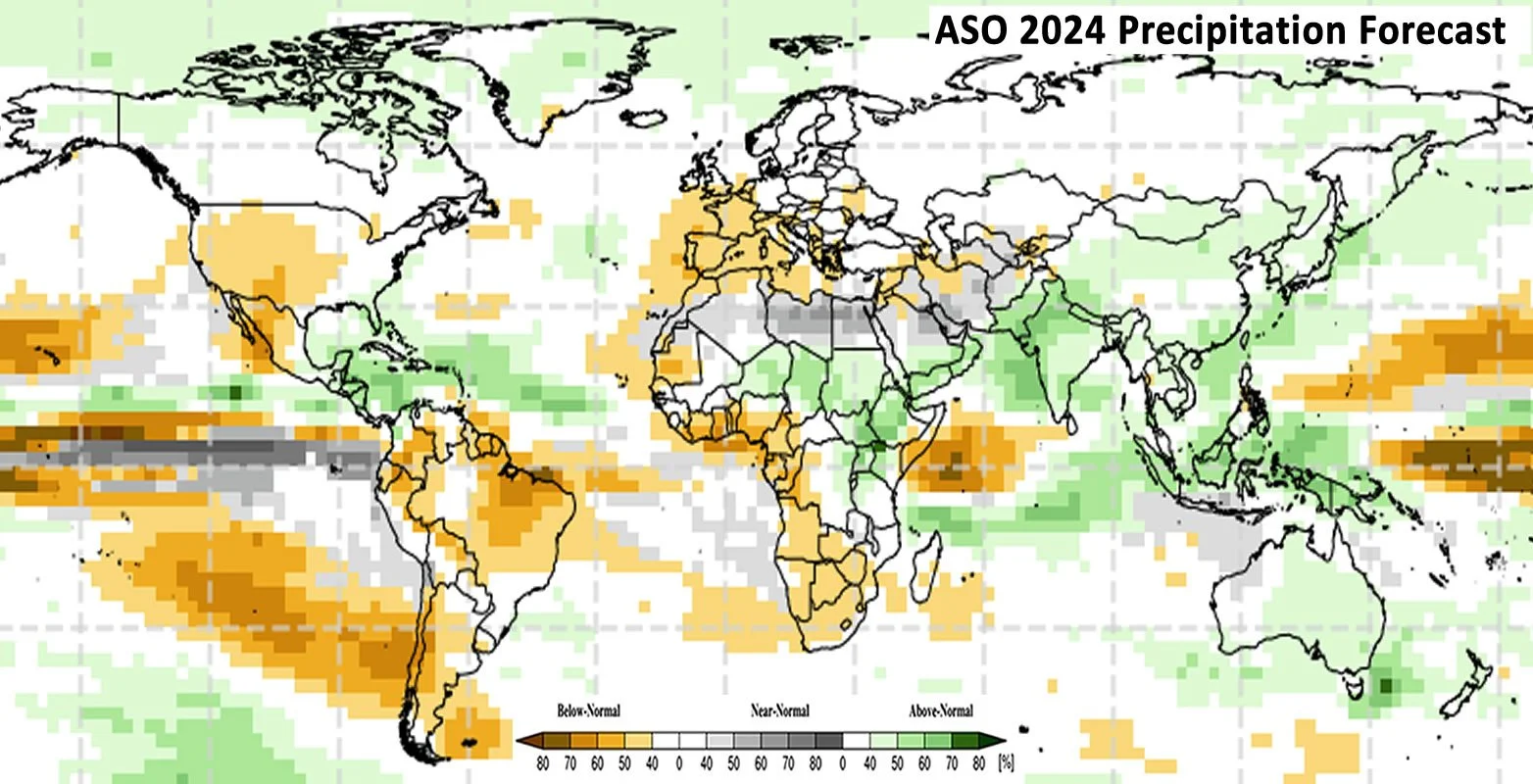 Reflecting a La Niña influence, the August-to-October seasonal forecasts indicate above-normal precipitation in India, the Maritime Continent, northern East Africa, the African Sahel region, and Central America. During late 2024 to early 2025, La Niña would raise the chances of below-average precipitation in eastern East Africa, central-southern Asia, southern South America, the southern United States, northern Mexico, and eastern East Asia. Above-average precipitation would become more likely in Southeast Asia, Australia, Southern Africa, and northern South America.