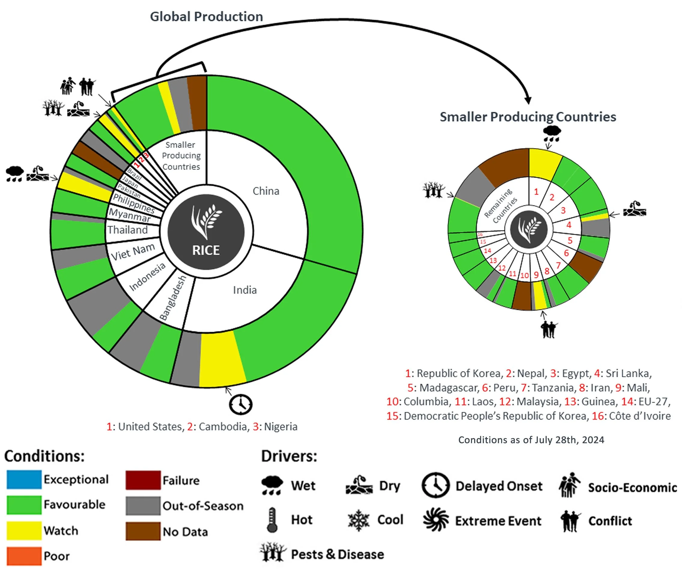 Pie Chart Description: Each slice represents a country's share of total Global production (5-year average). Main producing countries (representing 90-95 percent of production) are shown individually, with the remaining 5-10 percent grouped into the “Smaller Producing Countries” category. The proportion within each national slice is coloured according to the crop conditions within a specific growing area; grey indicates that the respective area is out of season. Sections within each slide are weighted by the sub-national production statistics (5-year average) of the respective country. The section within each national slice also accounts for multiple cropping seasons (e.g., spring and winter wheat). When conditions are other than ‘favourable’, icons are added that provide information on the key climatic drivers affecting conditions.