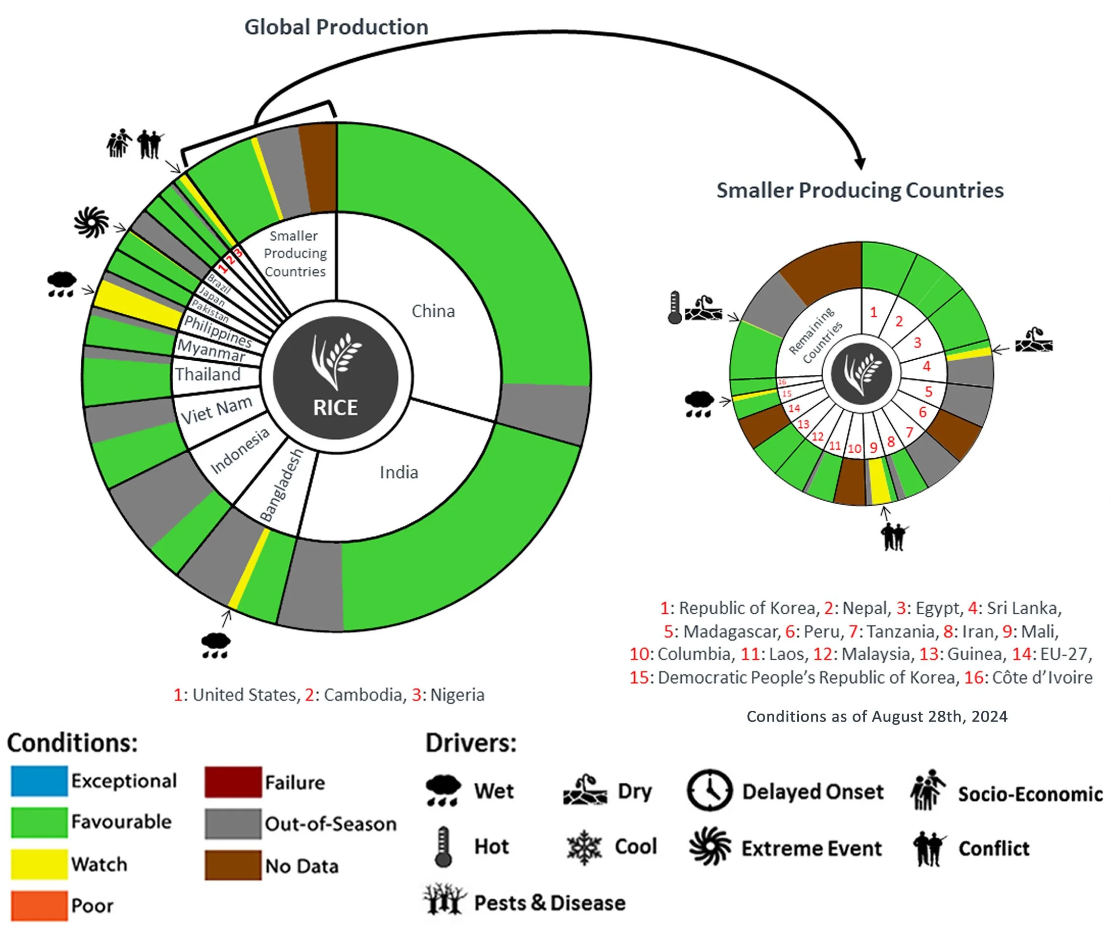 Pie Chart Description: Each slice represents a country's share of total Global production (5-year average). Main producing countries (representing 90-95 percent of production) are shown individually, with the remaining 5-10 percent grouped into the “Smaller Producing Countries” category. The proportion within each national slice is coloured according to the crop conditions within a specific growing area; grey indicates that the respective area is out of season. Sections within each slide are weighted by the sub-national production statistics (5-year average) of the respective country. The section within each national slice also accounts for multiple cropping seasons (e.g., spring and winter wheat). When conditions are other than ‘favourable’, icons are added that provide information on the key climatic drivers affecting conditions.