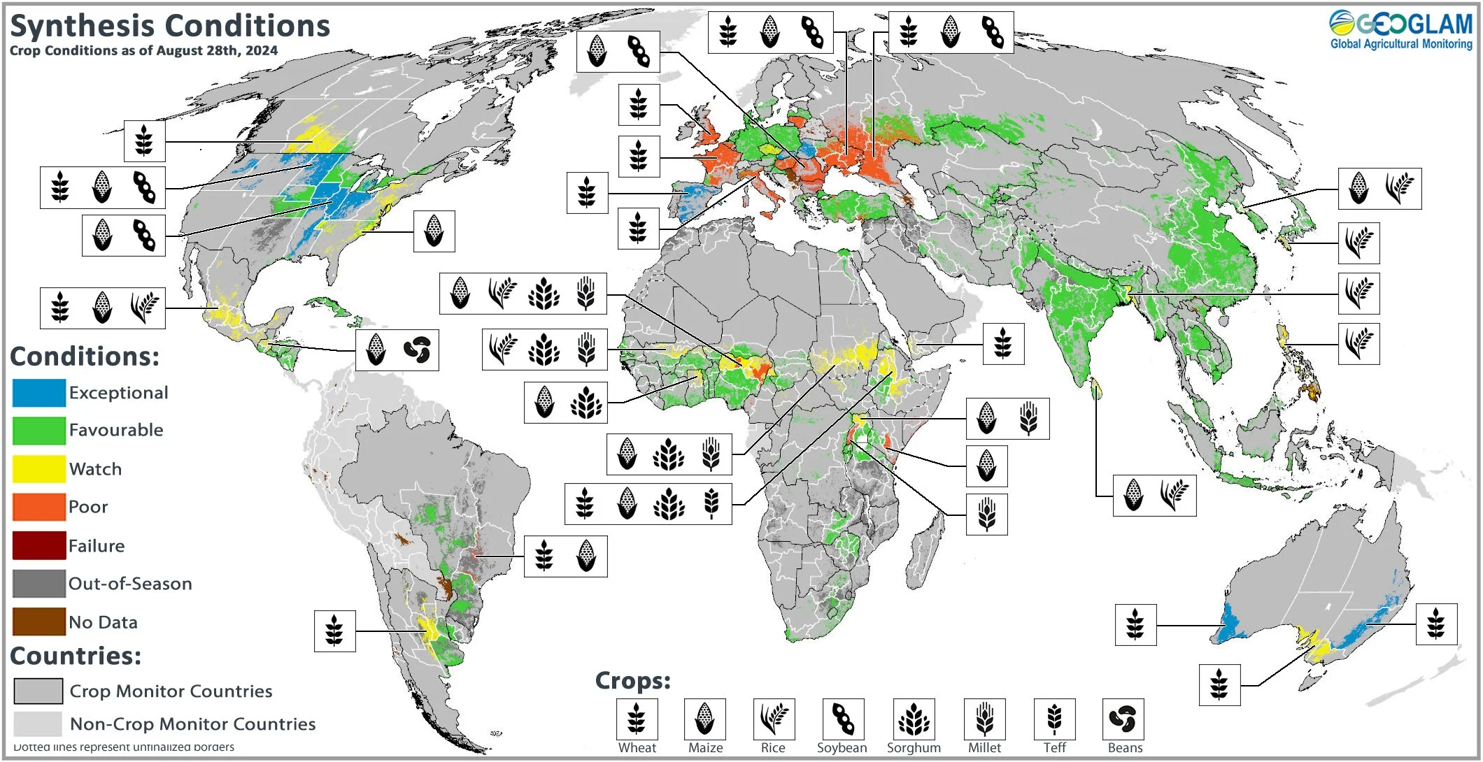 Crop condition map synthesizing information for all Crop Monitor crops as of August 28th. Crop conditions over the main growing areas are based on a combination of inputs including remotely sensed data, ground observations, field reports, and national and regional experts. Regions that are in other than favourable conditions are labeled on the map with a symbol representing the crop(s) affected.