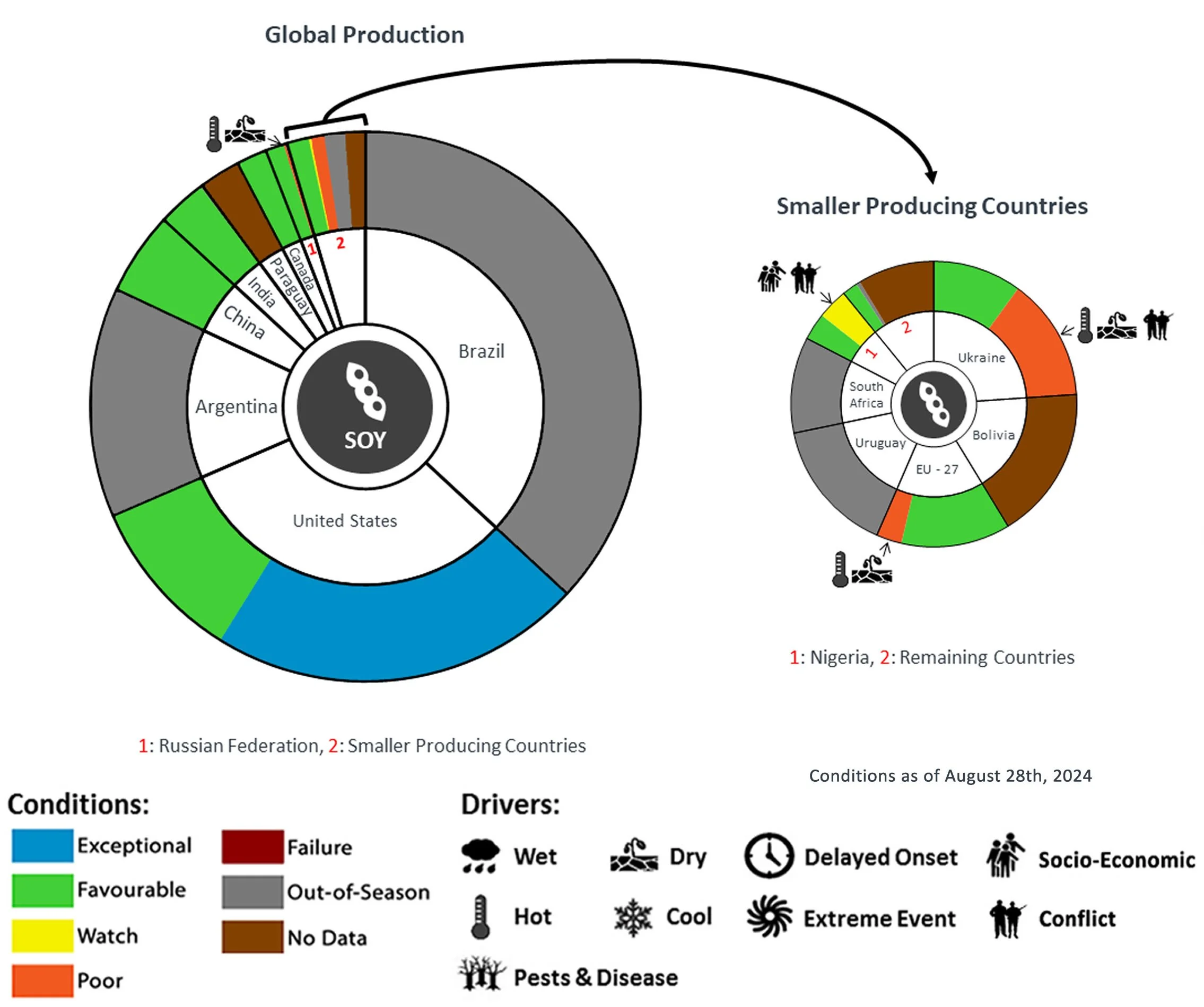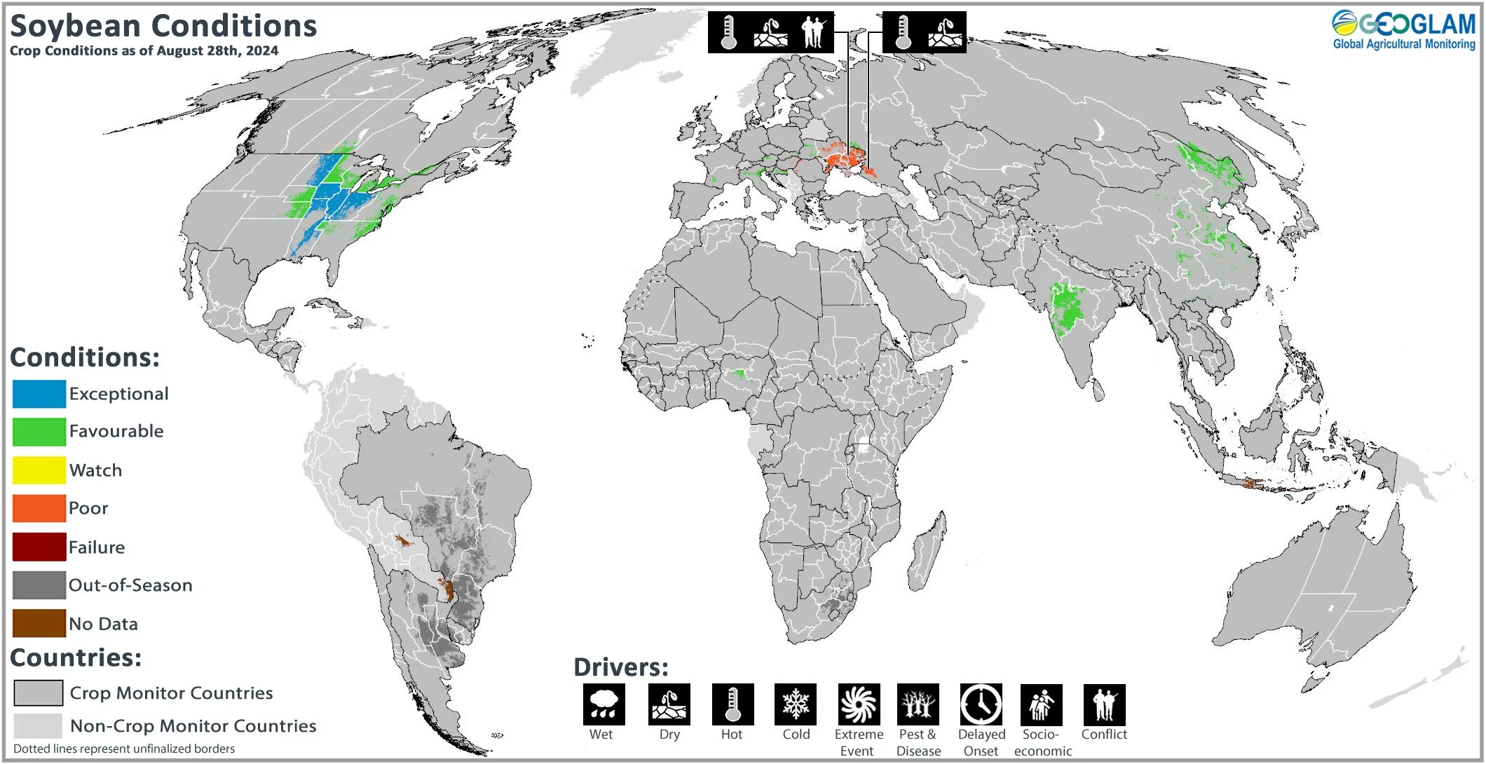 Soybean crop conditions over main growing areas are based upon a combination of national and regional crop analyst inputs along with earth observation data. Conditions are based upon information as of August 28th.