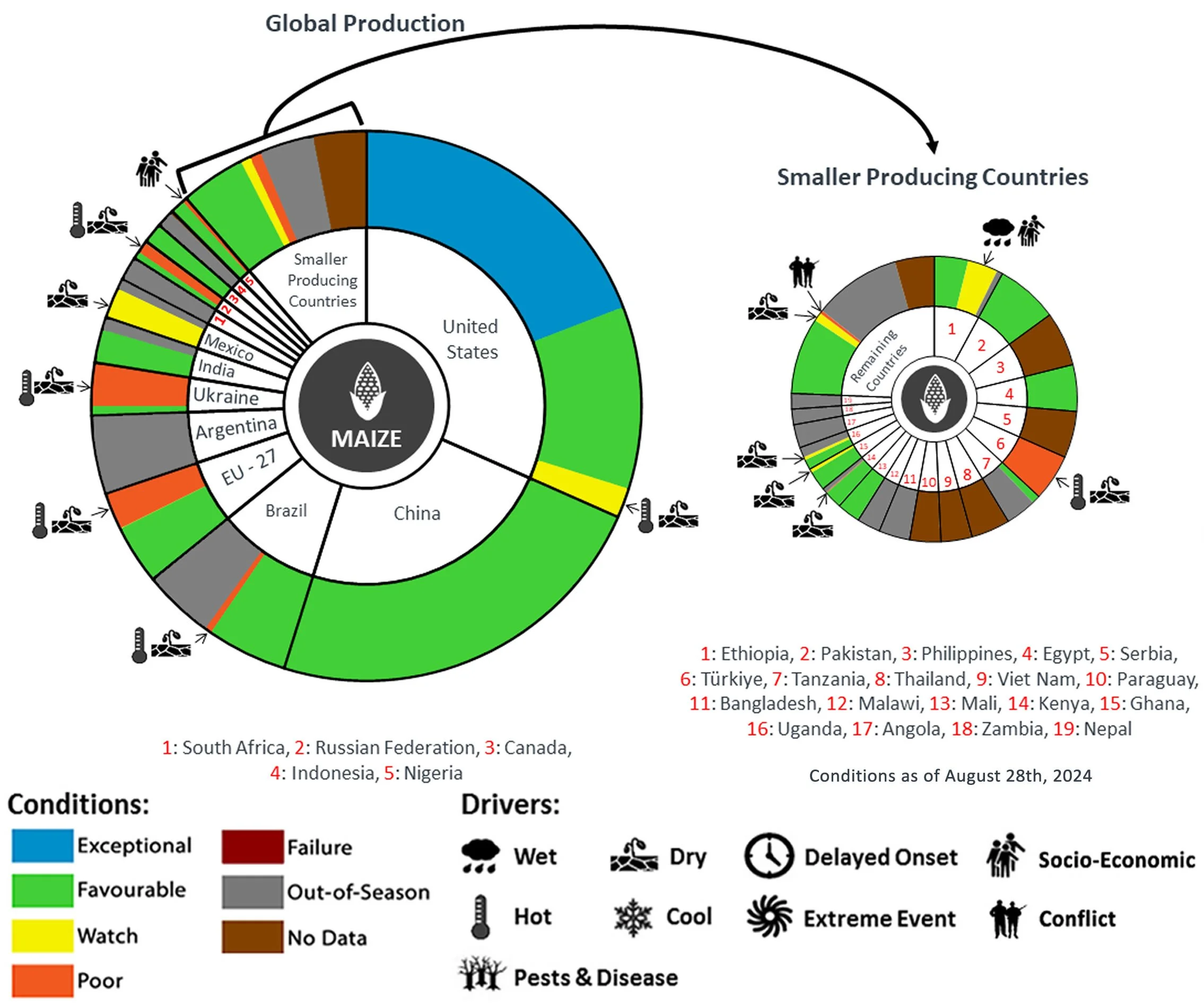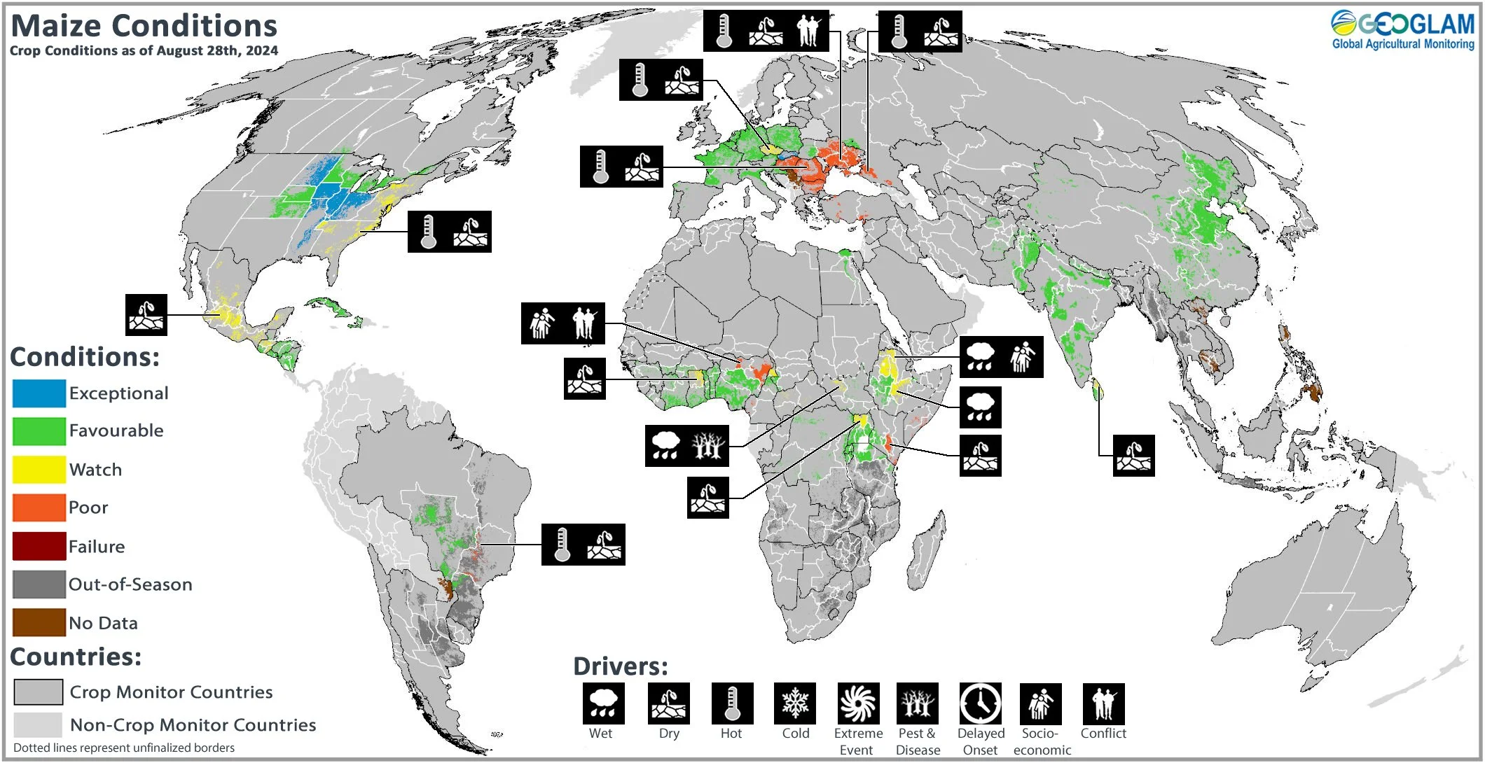 Maize crop conditions over main growing areas are based upon a combination of national and regional crop analyst inputs along with earth observation data. Conditions are based upon information as of August 28th.