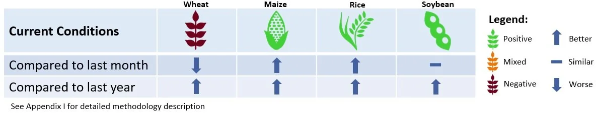Global crop conditions at the end of August are favourable for maize, rice, and soybeans, while negative for wheat. For wheat, yields are likely reduced in parts of Canada, Europe, the Russian Federation, and Ukraine. For maize, conditions are exceptional in most of the US, while areas of concern remain in Central America, Europe, the southern Russian Federation, Ukraine, and parts of Sub-Saharan Africa. For rice, conditions are generally favourable except for minor areas in Asia, Central America, and parts of West Africa. For soybeans, conditions are generally favourable except in parts of Eastern Europe, Ukraine, and the Russian Federation. The remaining crops are covered in the CM4EW publication.