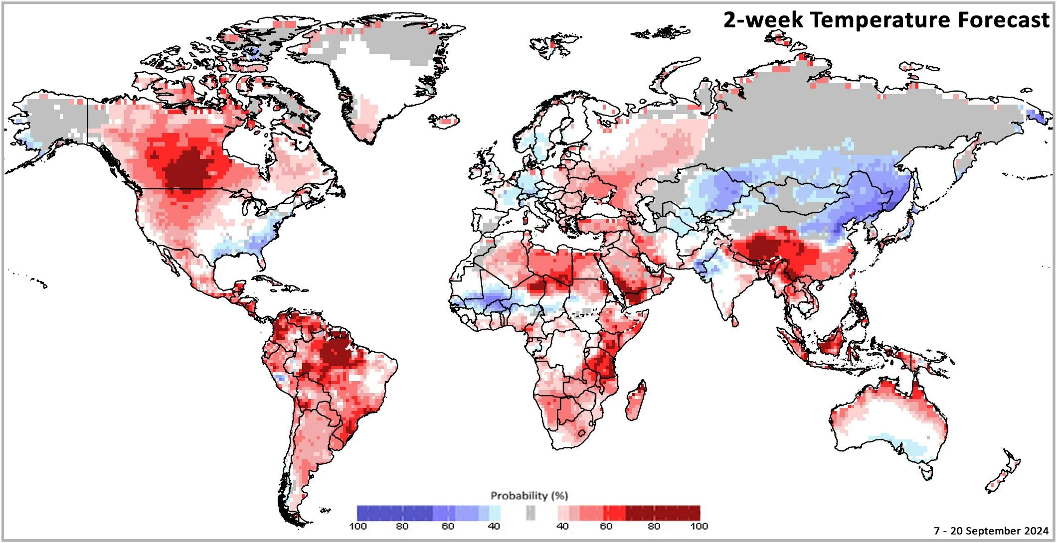 July 2024 was the hottest July on record and the 14th consecutive month of record-breaking global temperatures according to NOAA National Centers for Environmental Information (NCEI). 2024 will rank among the warmest years on record. Above-average temperatures are forecast in many regions during late 2024, continuing the elevated likelihood of adverse heat impacts. Excessive heat can be particularly damaging during periods of moisture stress or reproductive stages that determine final yields.