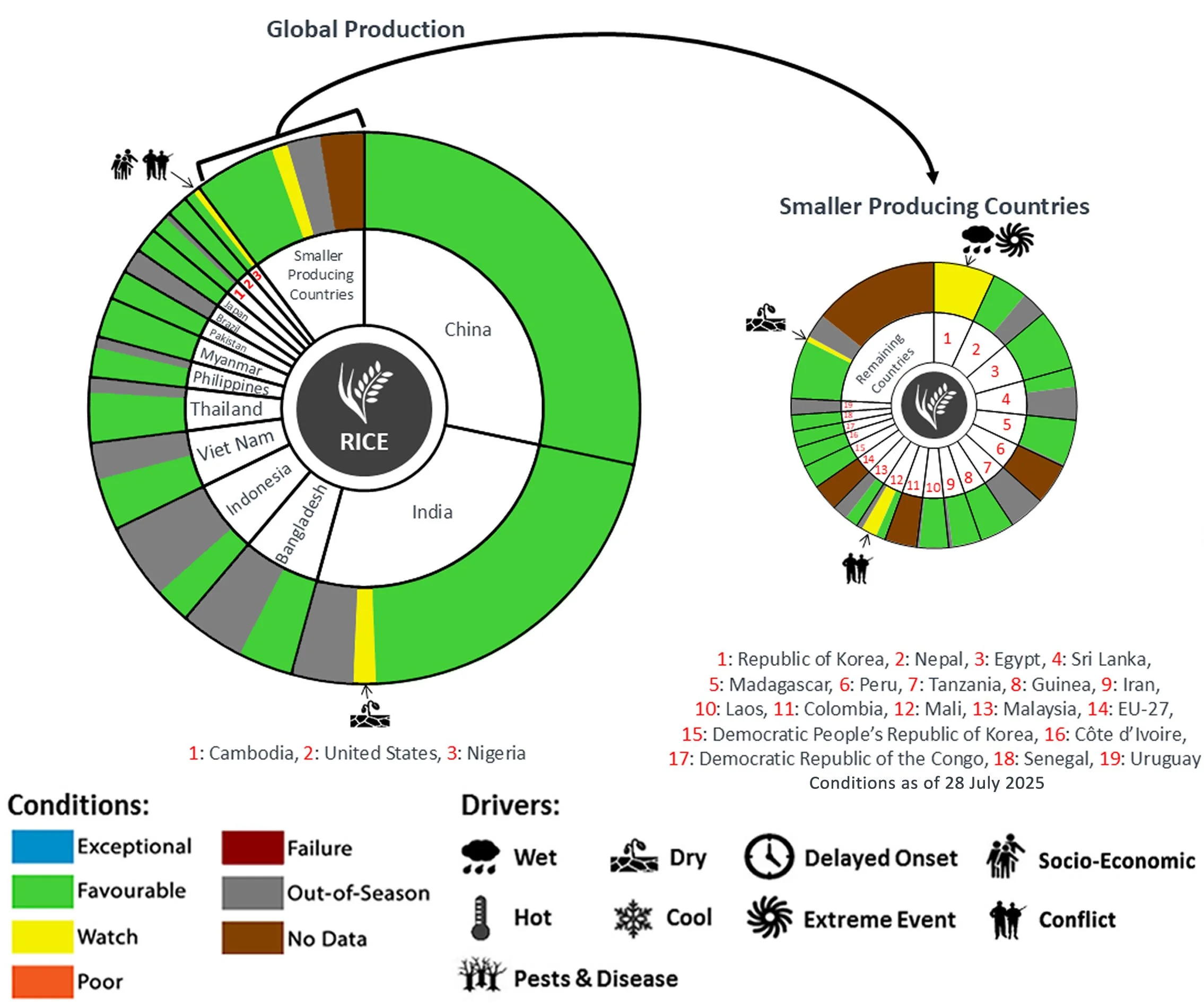In East Asia, the harvesting in China of the early double-crop (smallest season) is progressing alongside the sowing of the late double-crop (medium season). Single-season rice (largest season) continues to develop under favourable conditions. In the Republic of Korea, heavy rainfall mid-month flooded 25,065 hectares of local paddy fields — 3.6 percent of the nation’s entire rice production sites, particularly in South Chungcheong Province. In the Democratic People’s Republic of Korea, conditions are favourable. In Japan, conditions are favourable for early cultivation in the warm southwestern regions and first-season rice in Okinawa. In Central & South Asia, the transplanting of Kharif rice (larger season) in India is ongoing, albeit delayed in a few eastern and northeastern states due to rainfall deficits. In Pakistan, sowing of Kharif (summer) crops continues. In Bangladesh, harvesting for the Aus crop (smallest season) is beginning as the sowing of the Aman crop (medium season) continues. In Sri Lanka, Yala season crops (smallest season) continue to develop under favourable conditions. In Nepal, planting and development of the main season rice continues under favourable conditions. In Southeast Asia, the sowing of dry-season rice in Indonesia is continuing at a slower pace than last year, as earlier sown crops are beginning to be harvested. In Malaysia, the sowing of dry-season rice is wrapping up. In Brunei, most dry-season crops are in the early reproductive and ripening stages due to planting delays. In Viet Nam, the harvest of dry-season rice (winter-spring season) is wrapping in the north as the sowing of wet-season rice (summer-autumn season) continues. In the south, wet-season rice (summer-autumn season) is in the young panicle formation to grain filling stages. In Thailand, sowing of wet-season rice is progressing with an expected slight decrease in total area compared to last season. In the Philippines, wet-season rice is under favourable conditions, supported by sufficient rainfall. In Myanmar, the sowing of wet-season rice continues. In Cambodia, the sowing of wet-season rice is progressing. In the Americas, conditions are favourable in the US. In Cuba, the sowing of main-season rice continues. In Haiti, Printemps crops are under favourable conditions. In Honduras, conditions are favourable. In Europe, conditions are mixed for Türkiye due to drought. In MENA, conditions remain favourable in Iran and Egypt. In Sub-Saharan Africa, conditions are generally favourable in West Africa, albeit with areas of conflict in Mali and northern and northeastern Nigeria.