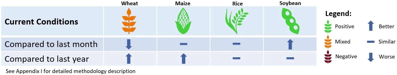 Crop conditions over the main growing areas are based on inputs, including remotely sensed data, ground observations, field reports, and national and regional experts. Regions in conditions other than favourable are labelled on the map with a symbol representing the crop(s) affected.